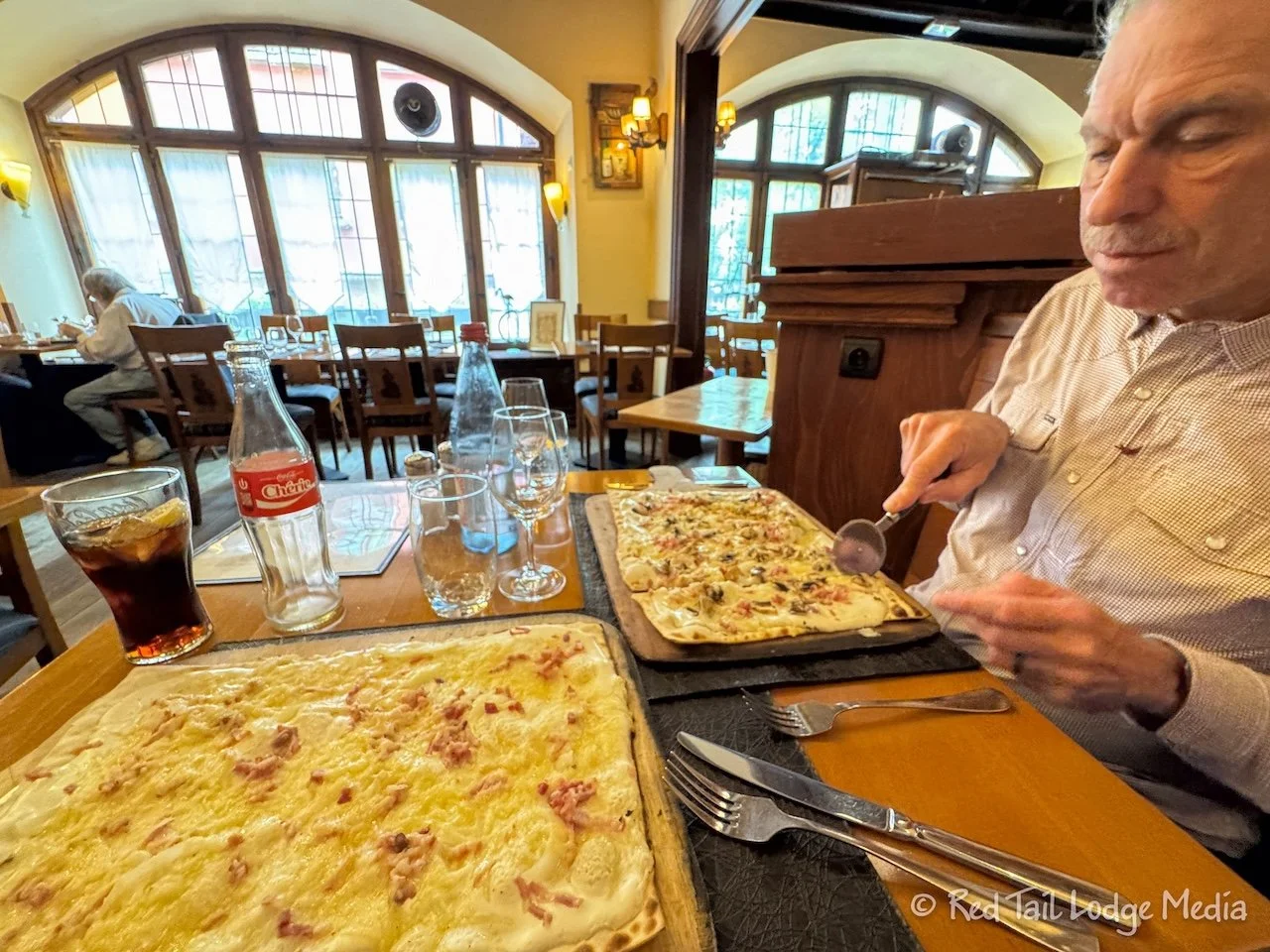 The square shaped Flammkuchen was served with small pizza cutters. We used it to cut our tarts, then ate it with our hands. We’re not sure if locals eat it with their hands or use a fork.