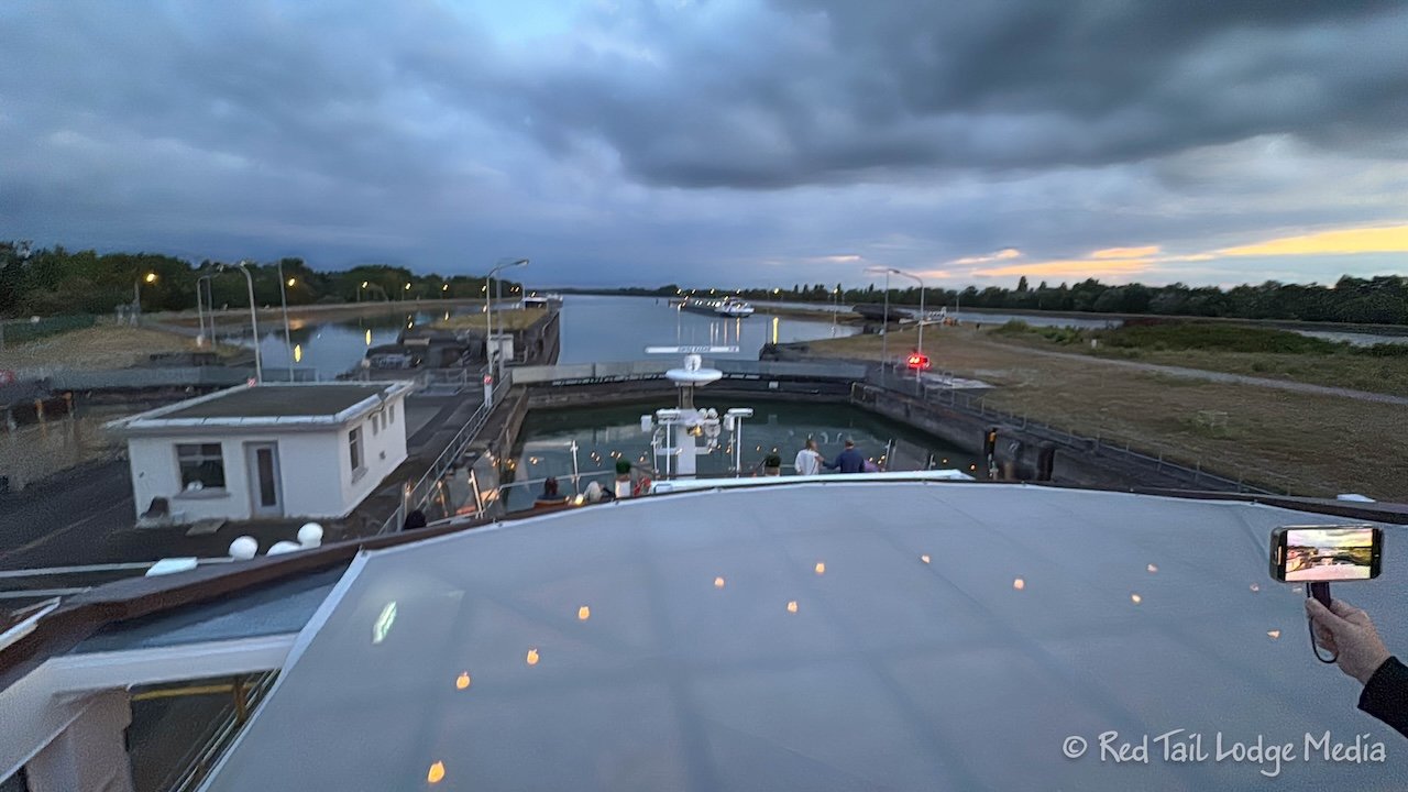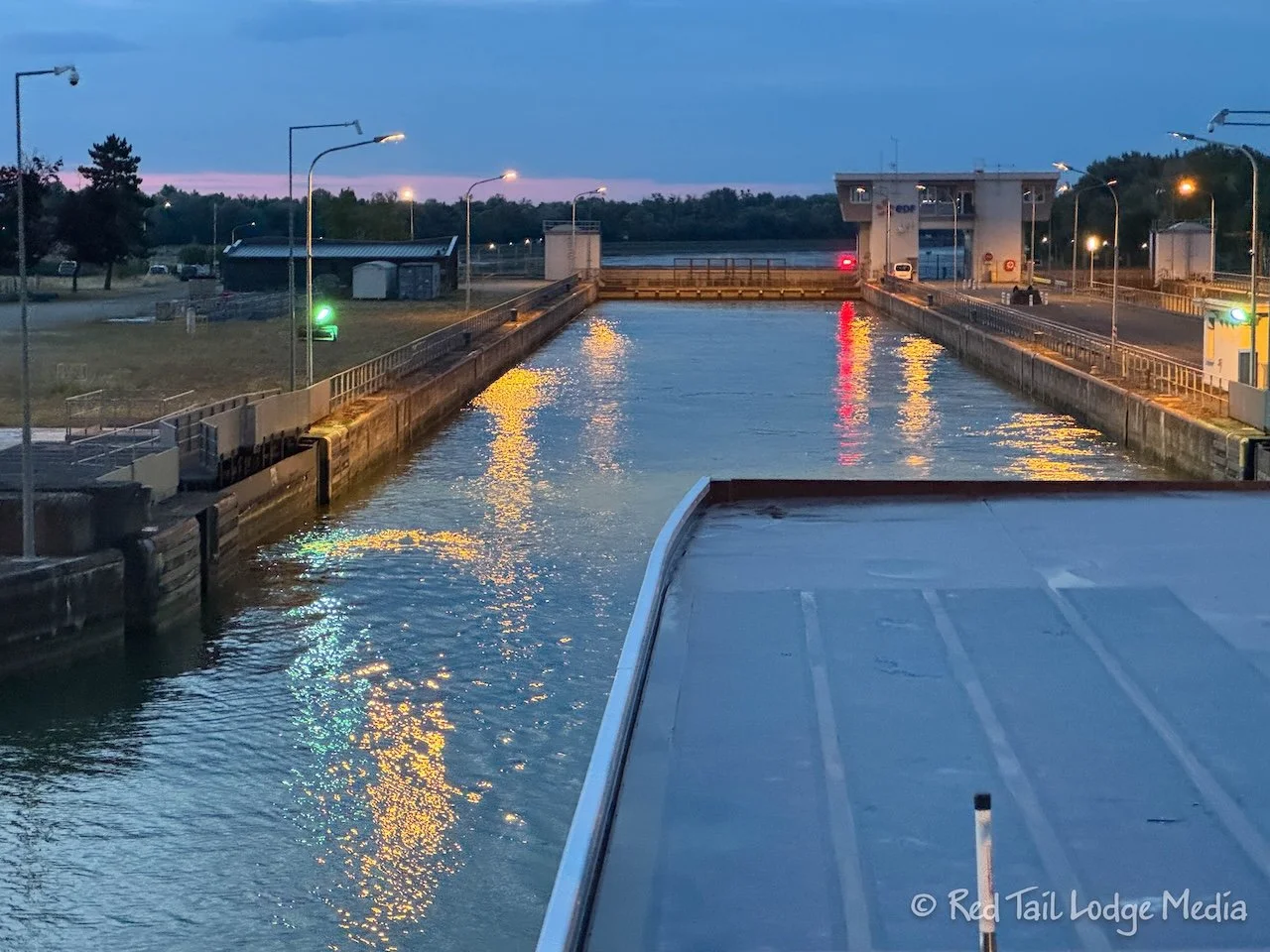 After dinner, we went up to the Sun Deck to watch our ship go through a lock around 9:15 pm. Most of the other locks that we had gone through were during the night. There was one lock that we went through during dinner, so we didn’t really see that one.