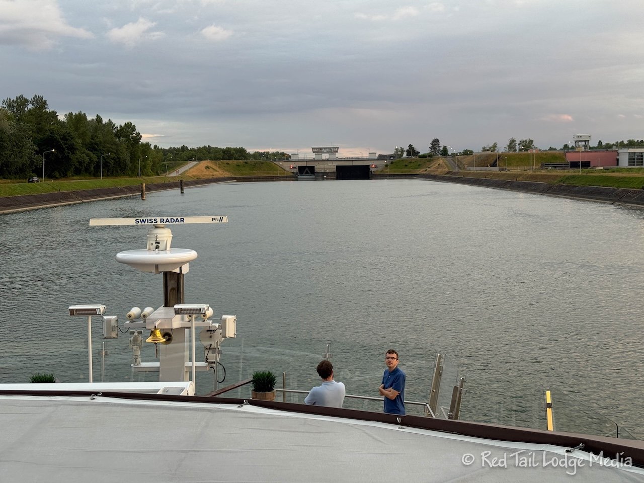 When going through the lock, the canopy over the tables up on the deck is lowered. They also lower the wheelhouse (bridge). We had to wait a few minutes while two ships heading the opposite direction came out of the lock. There were two locks, side-by-side. The smaller of the two was too small for our ship. The larger one can hold two ships next to each other. It was hard to tell if it could have accommodated two Viking ships at the same time, as we went through by ourselves.