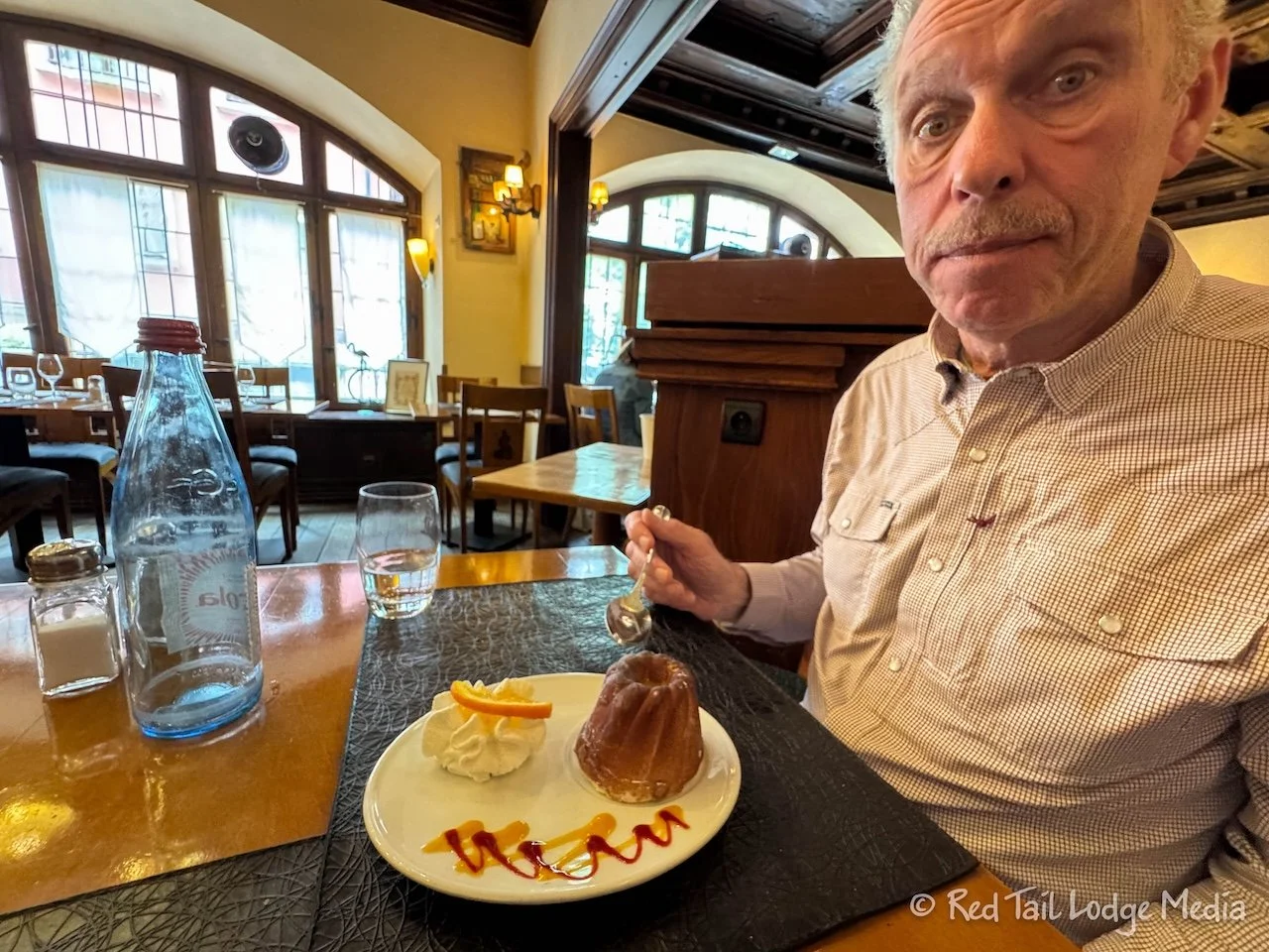 For dessert, we wanted to try the Koegelhopf that our tour guide recommended. She described it as a wedding cake, that was given as a gift for a wedding couple. On the menu was Koegelhopf Glacé. We weren’t quite sure what that meant. Was it ice cream made to look like a Koegelhopf cake? The English translation said Iced Koegelhopf, so was it the cake with an icing? We decided to take a chance and ordered one to split. It turned out to be the former, ice cream shaped to look like the cake. We were a little disappointed, but it was tasty.