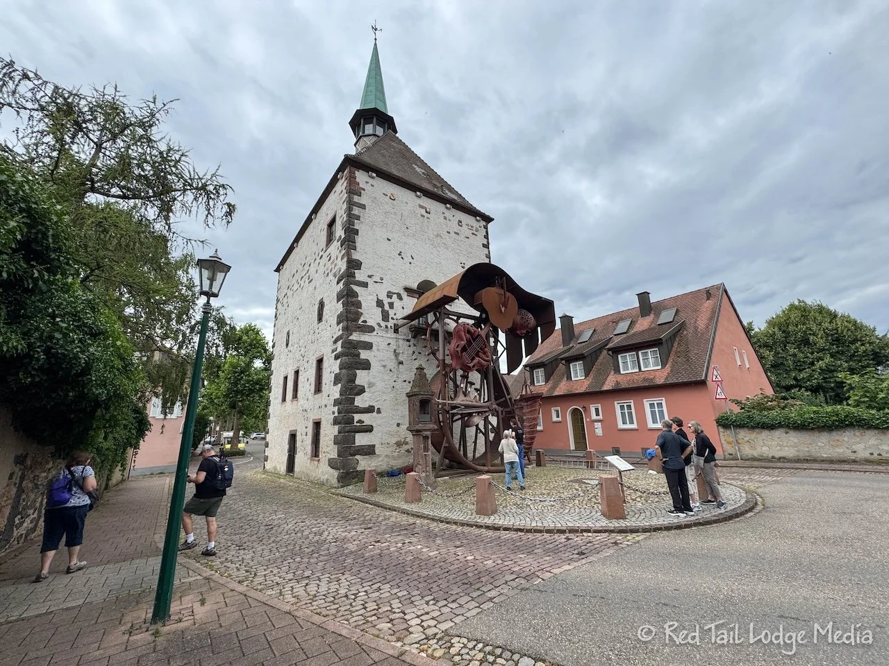 Outside the Radbrunnenturm is a piece of artwork, called the Wheel Stage (Radbühne), that was installed in 2013. While we were there, there was a man describing the artwork (in German) and he put the artwork in motion. A pendulum swings back and forth, with two figures at the end of the pendulum who roll a ball or globe to each other. It was a nice little gem to stumble across.