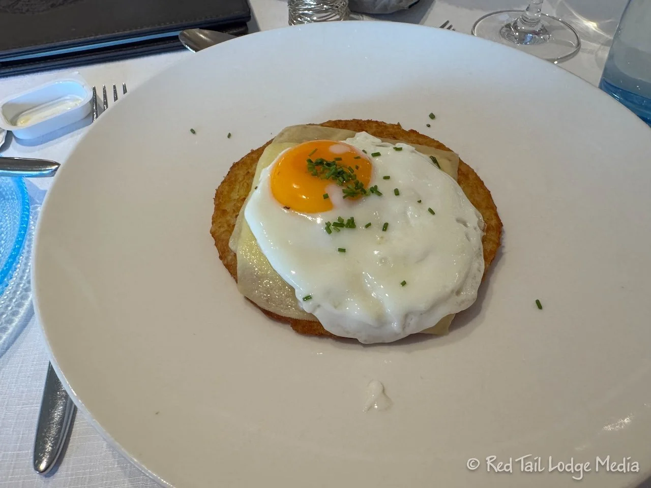 We arrived back at the ship in time for the captains toast before dinner. Then we had our last dinner on board. We went with the local specialty menu again. The main course was a Swiss rösti, covered with a layer of cheese and topped with a fried egg. Rösti is a fried potato dish, similar to hash browns. For dessert we had Black Forest Cake. It was our least favorite meal on the cruise for some reason.