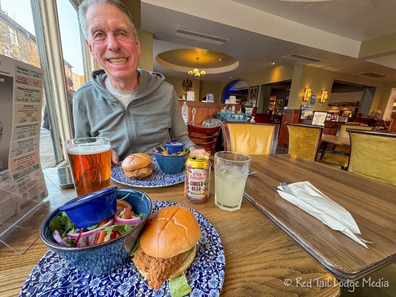 For dinner, we went to the Wetherspoon Pub, the pub connected with the King’s Head Inn where we were staying. It worked just like the first pub we visited. Menus were at the numbered tables and you paid when you ordered at the bar. Keith had the fried buttermilk chicken burger while Ann had the Korean chicken strip burger. We felt like we needed some vegetables, so we both got a side salad instead of chips (fries). It seems like the English call a hot sandwich on a round bun a burger, where Americans usually reserve the term burger for a sandwich with a ground meat patty and a round bun. To drink, Ann had an Old Jamaica Ginger Beer (non-alcoholic), while Keith drank a Darwin’s Origin beer by Salopian Brewery. The food was OK, but it was our least favorite meal so far in England.