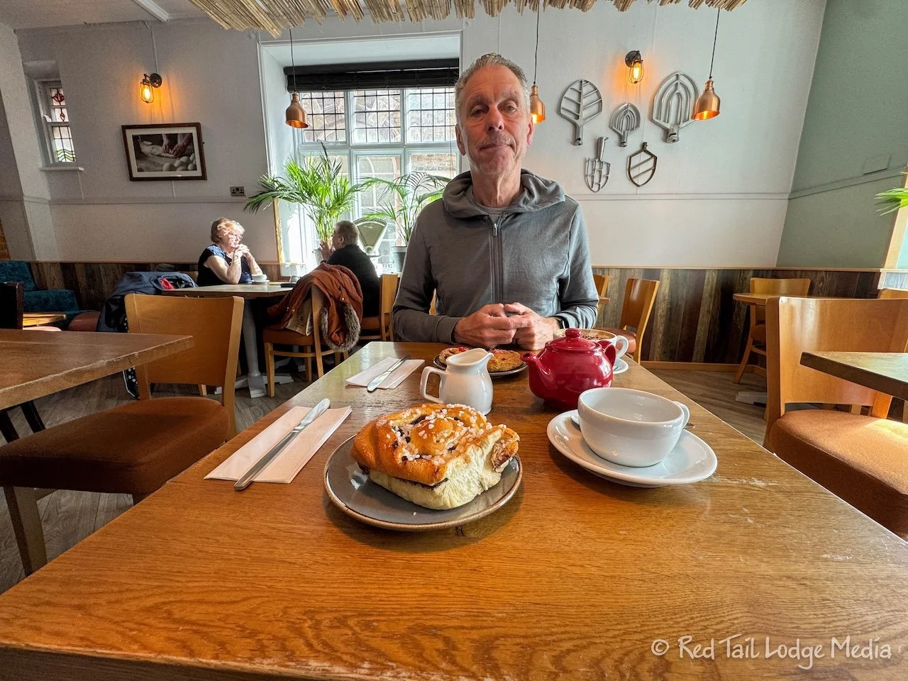 Back at the visitor center, we went into the cafe to grab a bite to eat. It was almost 10 am and we hadn’t had anything to eat yet. At the cafe, there was something they called a Breakfast Bap. It was a soft bun with a choice of sausages, bacon, or veggies. Ann ordered the sausage one while Keith had the bacon one. They each came with a small wedge of hash browns. To wash it all down, Ann had the tea with milk while Keith had a cappuccino.