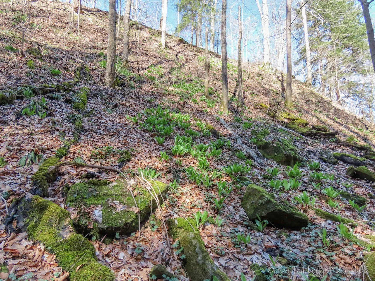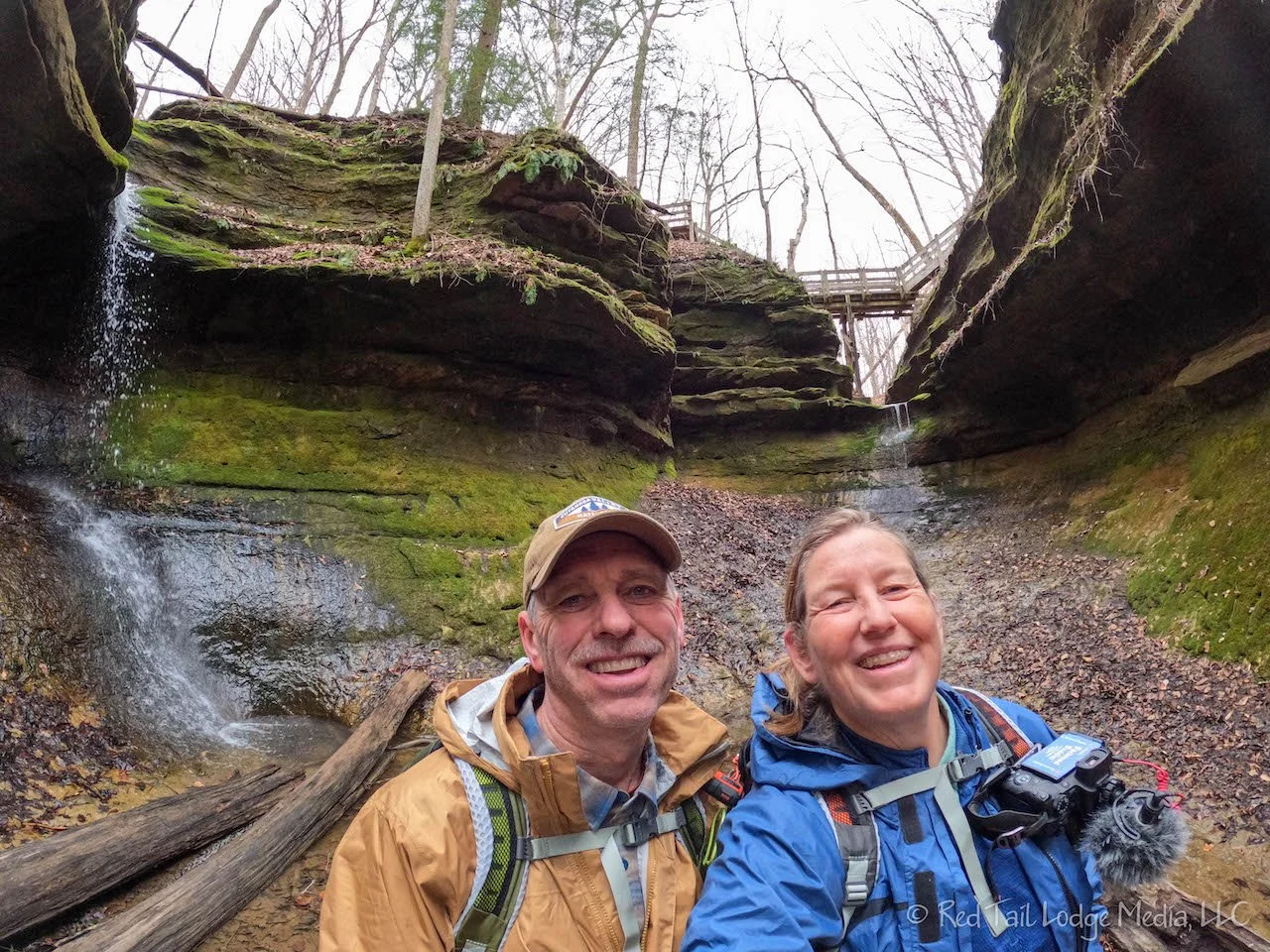 From the campground, we took the Backpack Trail over to Trail 8. We somehow missed the first turn off for Trail 8, so we were headed the other way down Trail 8 than we originally planned. The trail didn’t go far before dead-ending into Trail 7. We took Trail 7 down Kickapoo Ravine, the first of the six ravines we would hike down. The trail, if you could call it a trail at this point, followed the bottom of the ravine. It quickly became an obstacle course over tree trunks and boulders, requiring us to navigate our own routes through the mud and criss-crossing the small stream. Oh, this is what they mean by challenging!