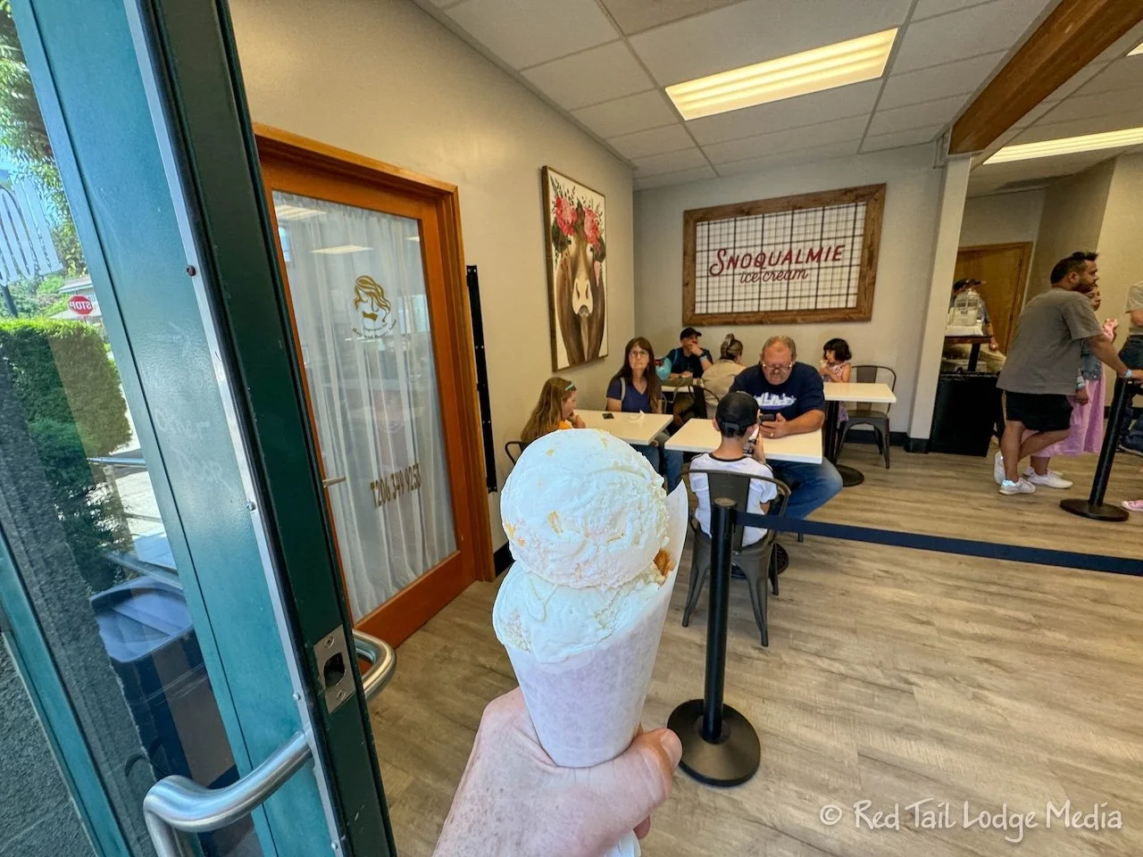 After the hike, we drove to historic downtown Snoqualmie for ice cream. The original location of Snoqualmie Ice Cream burnt down recently, but there is a temporary location just around the block while they rebuild. Keith had his usual vanilla shake, but Ann deviated from her normal pick of flavors to try a scoop of Yakima peach and a scoop of honey lavender. They were both delicious and refreshing.