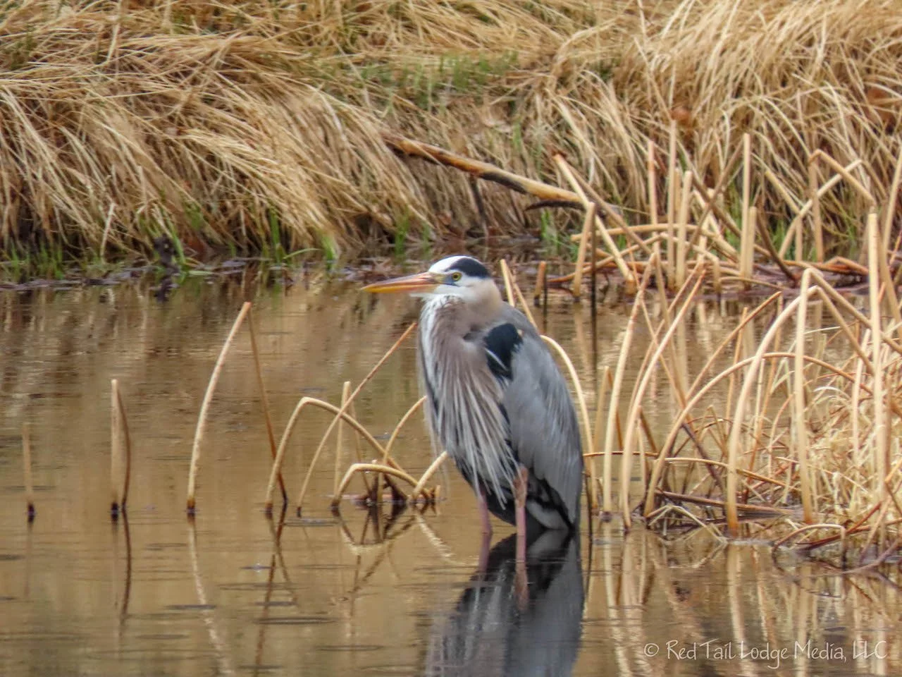 It rained pretty hard the rest of the day, so we hung out inside our Red Tail Lodge (our van). On one of Ann’s trips to the restroom during one of the lulls in the rain, she spotted a heron in one of the ponds. Of course she ran back to the van for her camera. Luckily the heron was still there when she got back. The heron didn’t look familiar to her, but, after studying her pictures later, she believes it was a Great Blue Heron. However, she has never seen one crouched down like that before. She normally sees them standing up tall, so you can see how long their necks are. Ann guesses he was scrunching down because of the rain. We would imagine that it would be hard to see into the water to fish with the rain drops rippling the surface of the water.