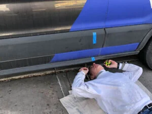 After eating our lunch, LB crawled under the van to see if he could see any issues. He saw a small amount of what he believed to be transmission fluid dripping down, but could not see where it was leaking from. We texted our daughter to see if she could check our driveway for spots of leaking fluid. There was nothing that looked like transmission fluid. A local woman getting in her vehicle parked next to ours was very friendly and helpful and gave us the name of a mechanic that she recommends and uses. As we looked through the car manual and discovered there is no way for us to check the transmission fluid level ourselves, we decided to drive over to the local Ford dealer to have our van looked at. When we got there, the dealer could not get our van in to even look at it until the following day. However, he recommended not using the Tow Haul mode and we should probably be fine. He suspected when the transmission overheated, a small amount of transmission fluid came out the pressure release vent. So we continued on our way.