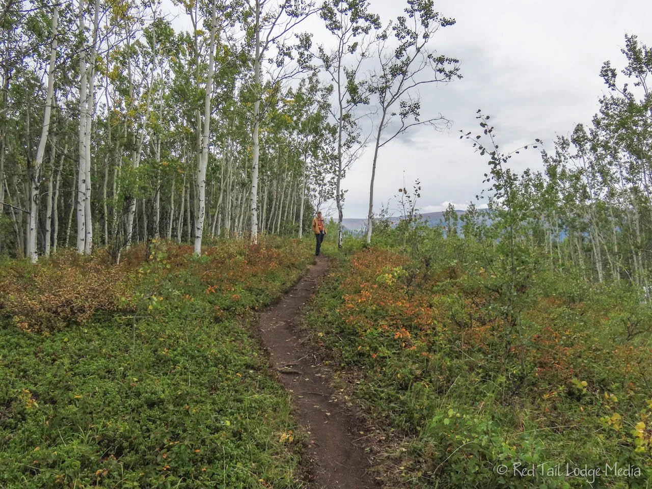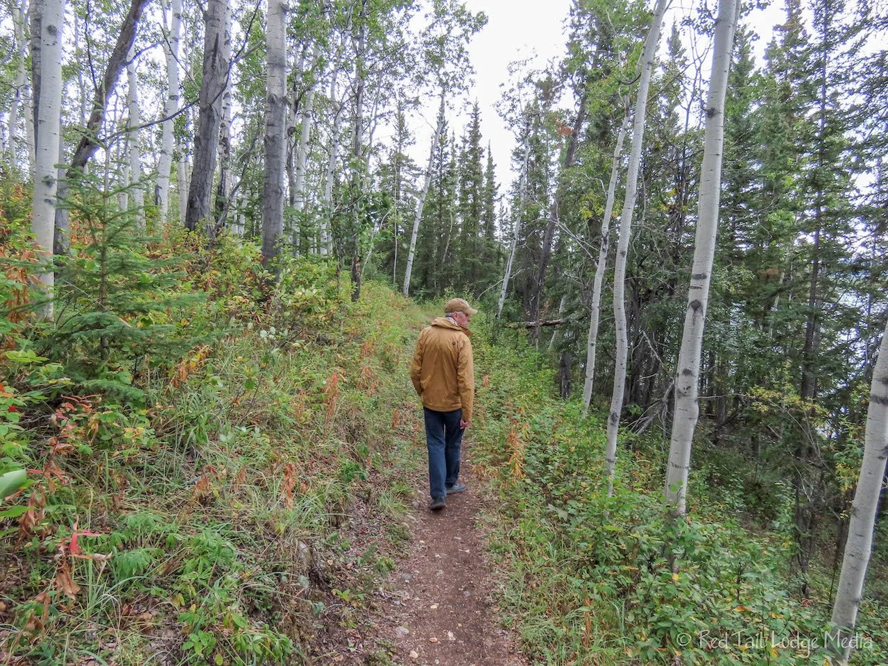 The first trail was the Lake Shore Trail, which followed the shoreline north from our camp site. It was a pleasant little dirt trail through the spruce and aspen trees, with a few little spurs that took you over to the rocky shore. A variety of berries and rose hips lined the path. Birds were darting from tree to tree, filling the air with their chirping. A couple of loons were in the turquoise water of a little cove next to the trail.
