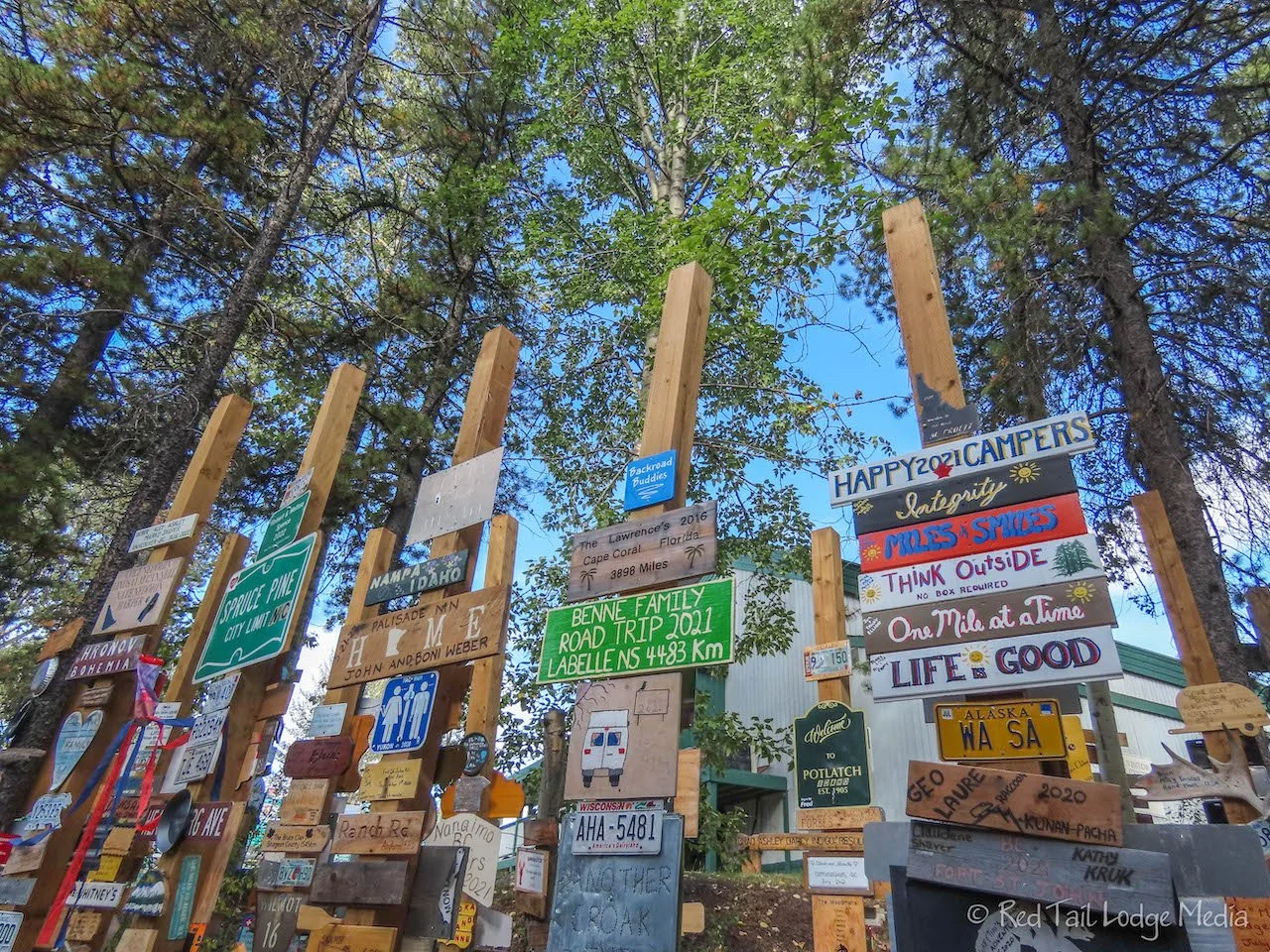 Our original plan was to stay two nights at Watson Lake again. However, due to the holiday weekend coming up, our next destination, Tā Ch’ilā Provincial Park, required a three night minimum in order to make a reservation. So we cut our stay in Watson Lake to one night. We don’t like driving two days in a row, but the drive from Watson Lake to Tā Ch’ilā is only about an hour and a half (Google Map time). Since we had a short drive on Friday, we took our time leaving Watson Lake. After a leisurely breakfast, we emptied our gray water cans and filled our fresh water cans. Then we walked over to the grocery store and bought a few items to get us through the next week. Just out of curiosity, we walked over to the Sign Post Forest, just to see if our sign, that we hung earlier on our way north, was still there. Yup!