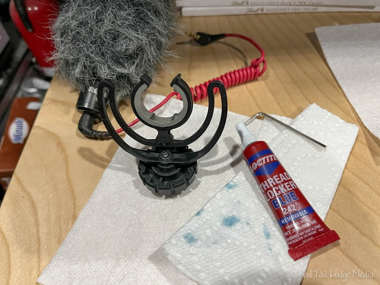 While Ann was gluing the cold shoe back together with super glue, she applied thread locker to the problematic screw. Now she has no issues with the external microphone attachment and no longer needs to carry an Allen wrench on hikes.