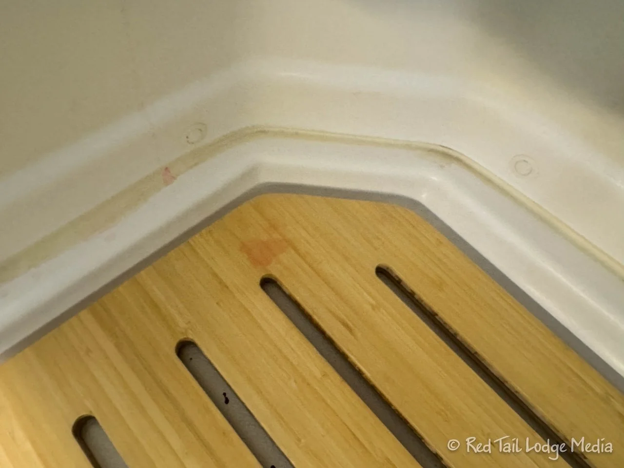RV antifreeze is bright pink. Spills and drips happen. We didn’t think much of it, since we thought the antifreeze wouldn’t harm anything. However, some ended up on our wooden shower floor. We didn’t notice it right away. It is now a permanent stain.