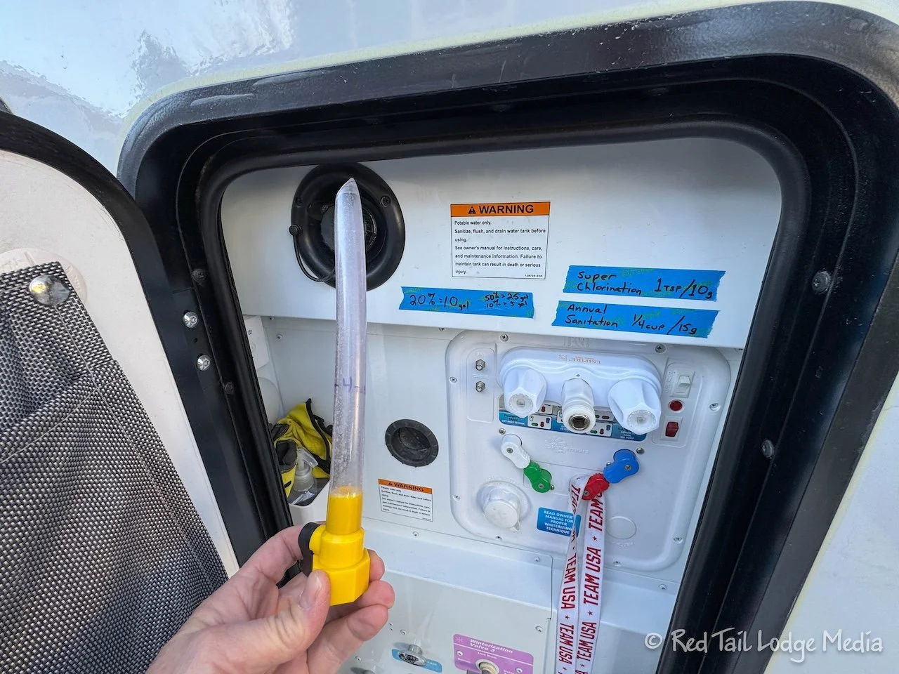 Every couple of weeks or so, we like to add bleach to our fresh water tank to make sure it stays fresh and clean. Instead of getting out the measuring spoons or cups every time, we marked the filler tube (paid link) for 4 teaspoons of bleach, which is the right amount for 40 gallons of water (we normally only fill our tank to 80%). Now we close the valve on the filler tube, pour in bleach up to the line, then put the tube into the tank fill and open up the valve. The bleach flows into the tank and the water flushes the bleach into the tank as we fill the tank. We don’t even need to look up how much bleach we need to put in. Although we do keep the amounts for both the periodic sanitization and the annual sanitation posted inside the water compartment.