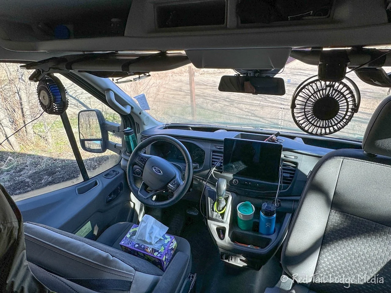 There are times when condensation (or frost) builds up on the windows overnight, especially on the windshield. This can slow you down in the morning if you are trying to hit the road early. To speed up the process, we aimed our small DC fans (paid link) onto the windshield while we were packing up the rest of the rig. Sometimes we still have to wipe down the windshield or run the defroster before leaving, but it makes for a faster getaway. We keep a couple of clean microfiber towels in the driver and passenger doors so they are handy for wiping the windows, if needed.