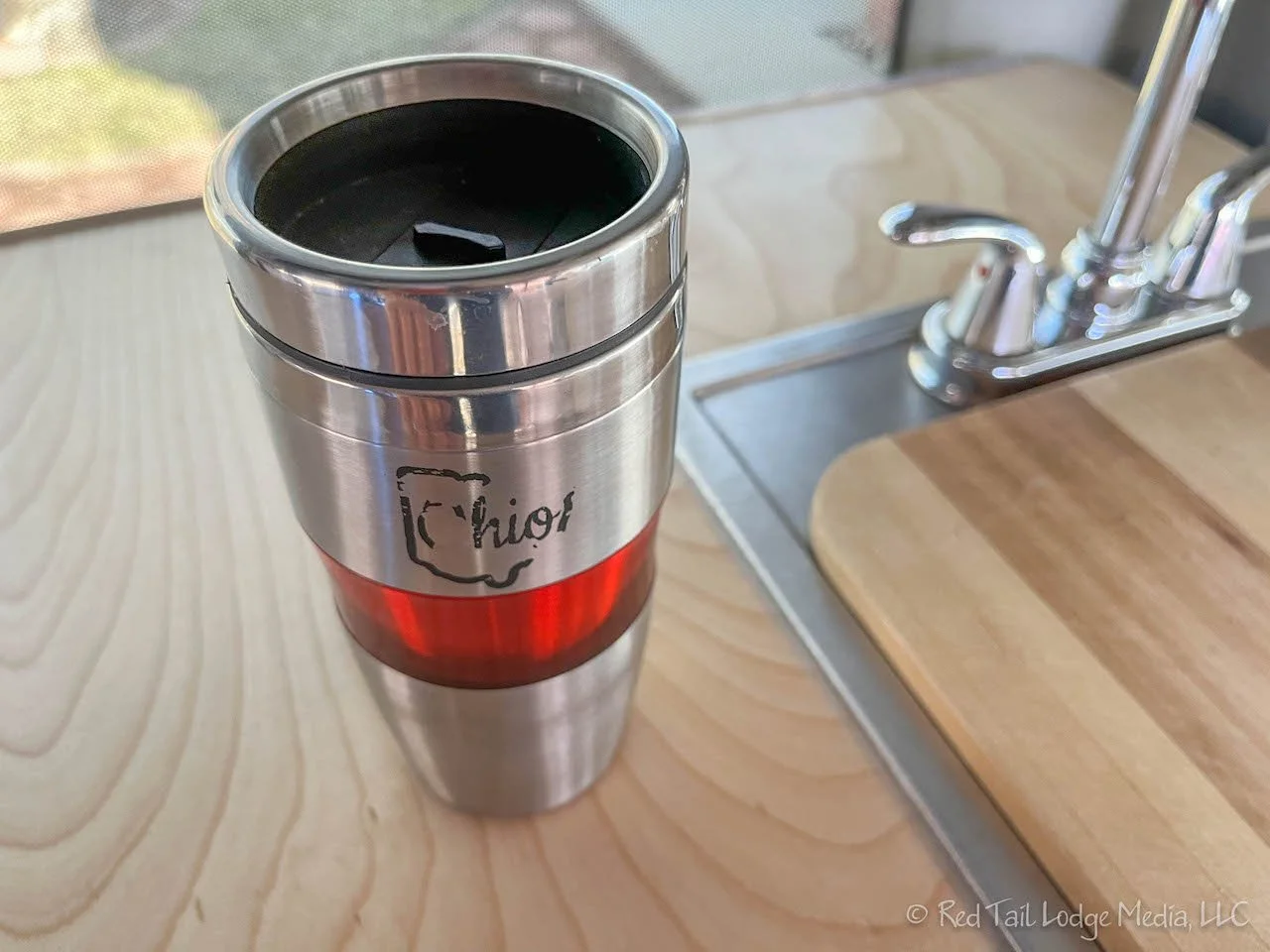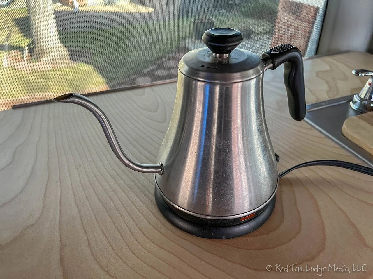 Tip Twelve: When the batteries are low, use the electric tea kettle (paid link) to heat water for dishes instead of the water heater. The tea kettle will use less electricity to heat up the smaller volume of water, but yet provides enough hot water for dishes when mixed with cold water to bring the temperature down from boiling.