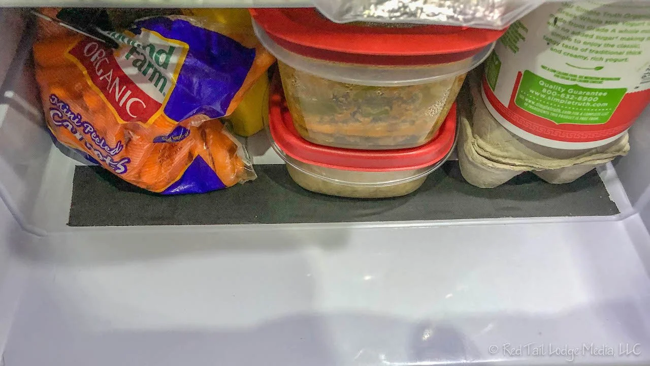 Tip Nine: Put a strip of Gaffers tape on bottom of fridge to keep items from sliding out. The bottom of our fridge is rather smooth and, due to the small size of our fridge, we pack it pretty full. Sometimes, when we open the fridge door, items come sliding out, especially when van is not level. A simple strip of Gaffers tape (paid link) provides enough friction to keep the items in place.