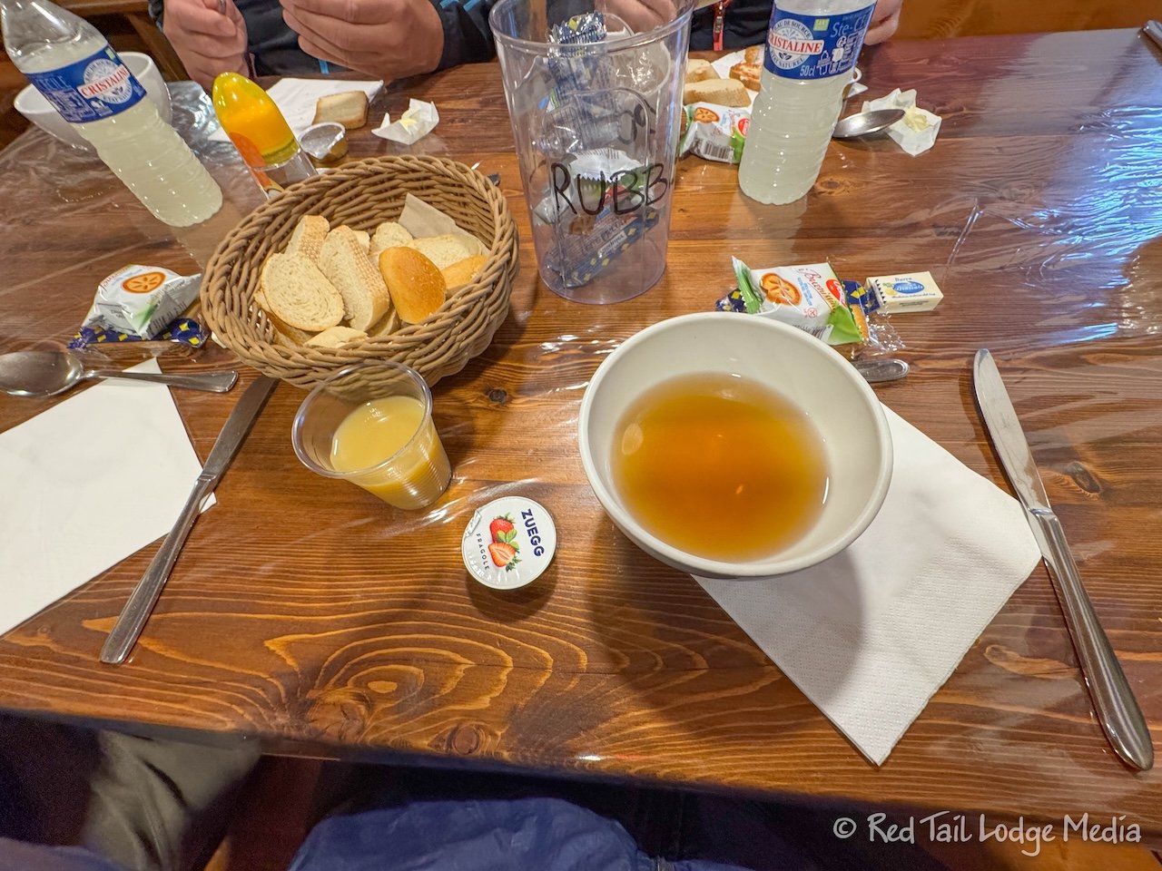 Thursday, Day 12 of the TMB, was our easiest hiking day yet. Breakfast at Rifugio Bertone was very simple, just bread, butter, jam, prepackaged toast (more like croutons), and prepackaged cookies. There were no coffee mugs, so tea, coffee, and hot chocolate was served in cereal bowls. It was a rather disappointing breakfast, but it gave us some calories to hike with.