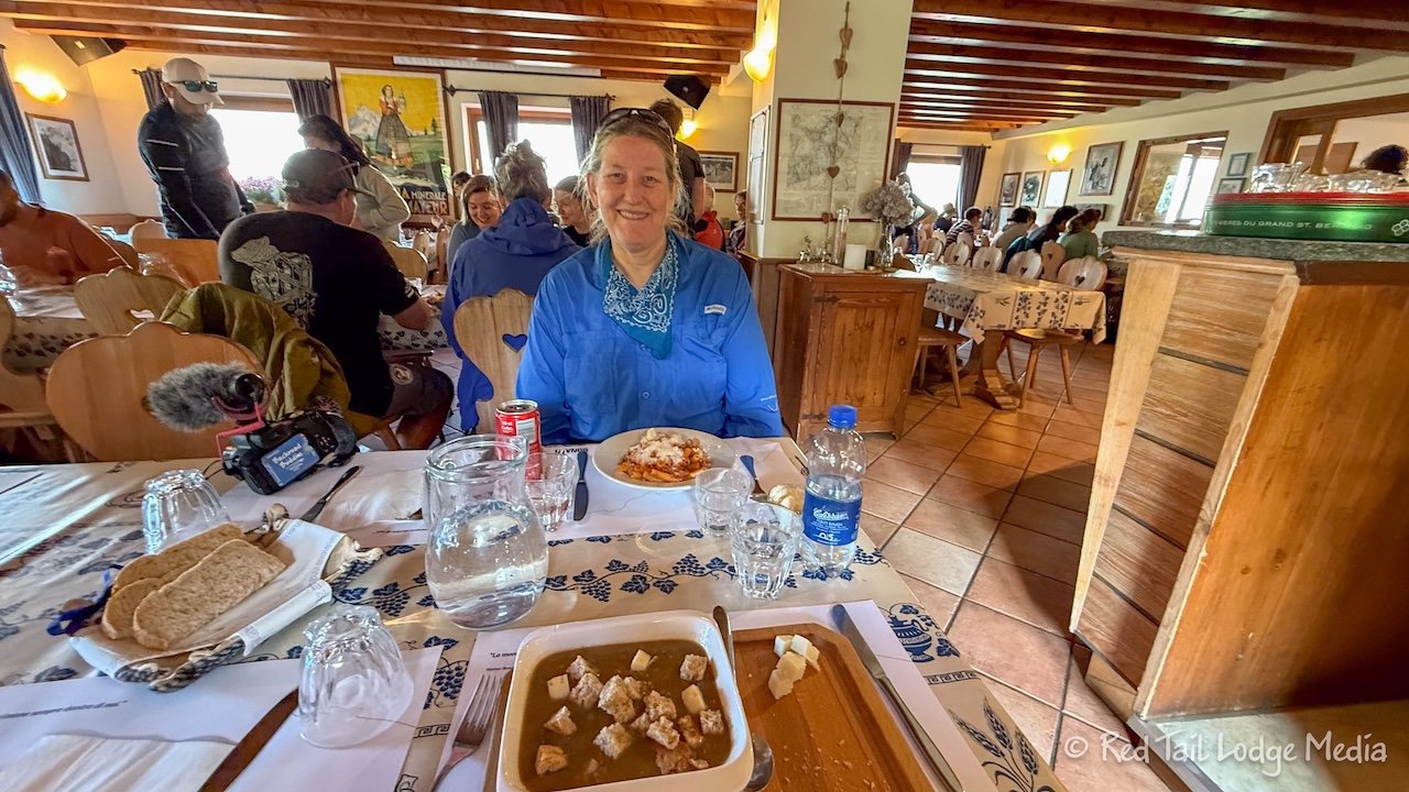 It was a little cool outside, so we sat at a table inside for lunch. Keith had the lentil soup while Ann chose the pasta ragu. Ann decided to splurge and have dessert with lunch. It was a chocolate and pear cake. She had seen that before on the menu at Rifugio Maison Vieille, so she was intrigued to try it. It was delicious.