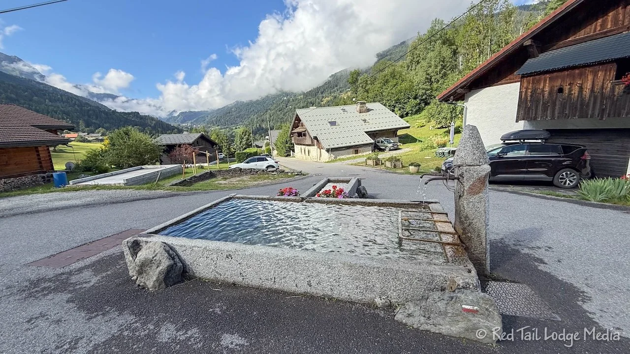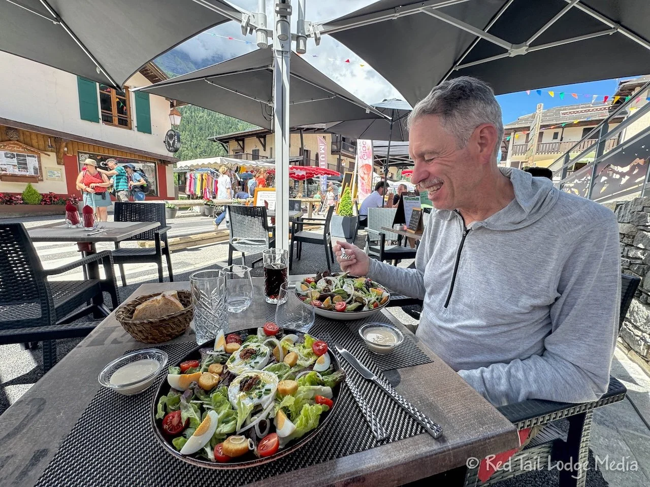 Of course, as we got closer to the town of Les Contamines-Montjoie, there were all kinds of benches to sit on near the trail. We walked through the center of town. A market was just finishing up. Ann managed to buy a nectarine before a farmer closed his stand. Well, she tried to buy just one, but he threw in another one for free.