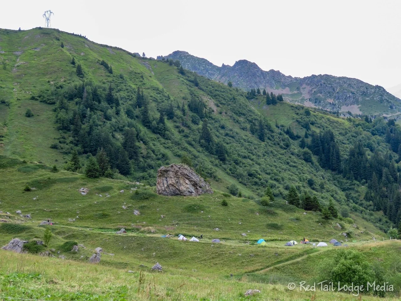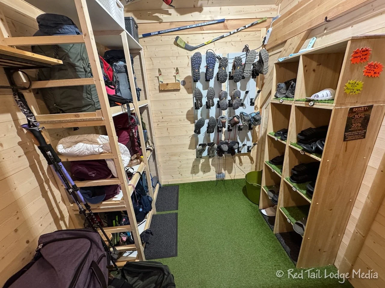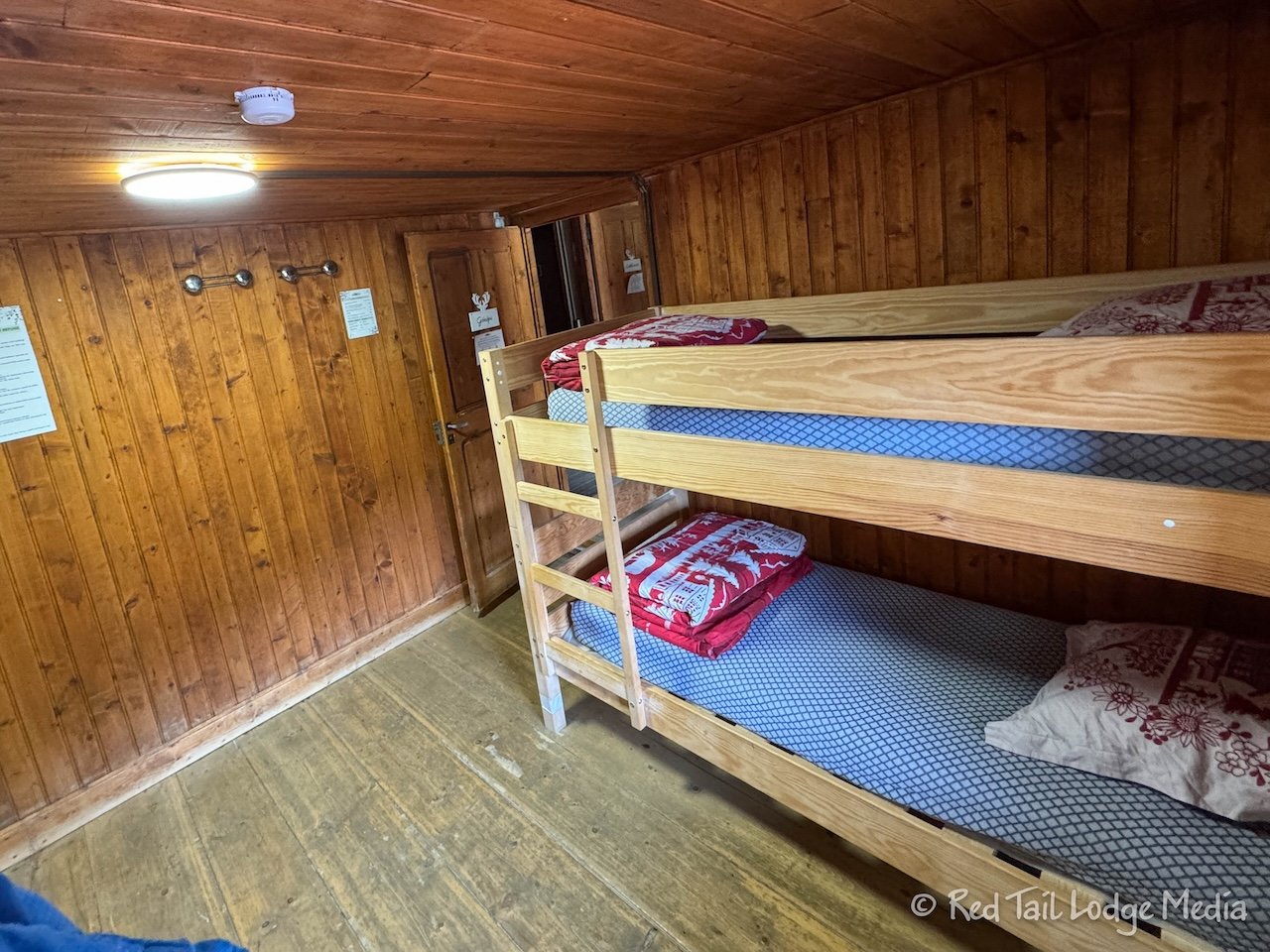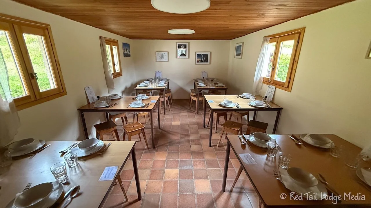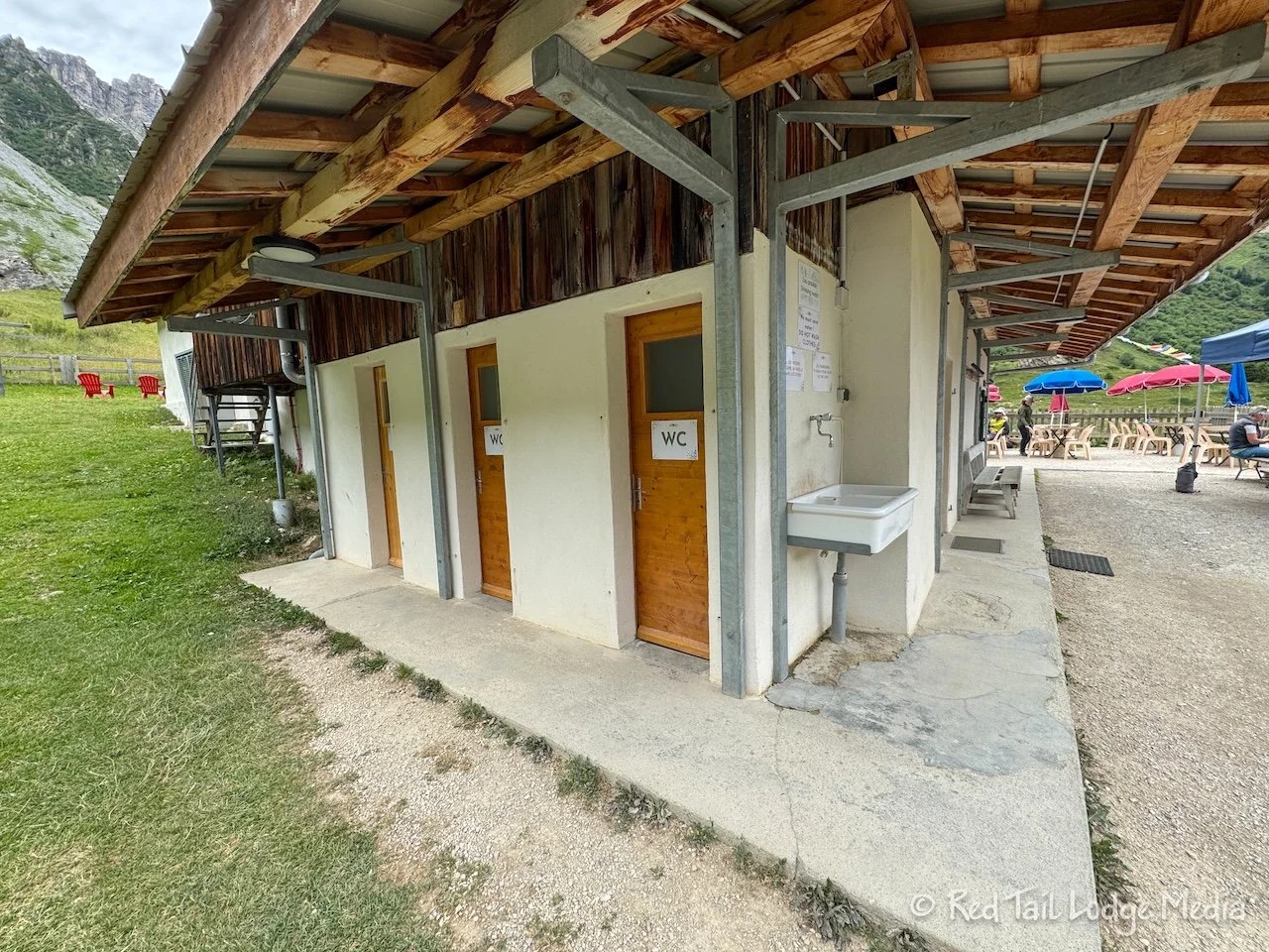 Everything was separated out so you had to go outside to reach everything. One building contained the storage for our backpacks, poles, and shoes. In a separate door of the same building were the showers. On the outside of the building, under an overhang, were the sinks. In the back of the main building were the toilets, each with an outside door. The dining area was in a separate building. The rest of the main building was where the kitchen and rooms were.