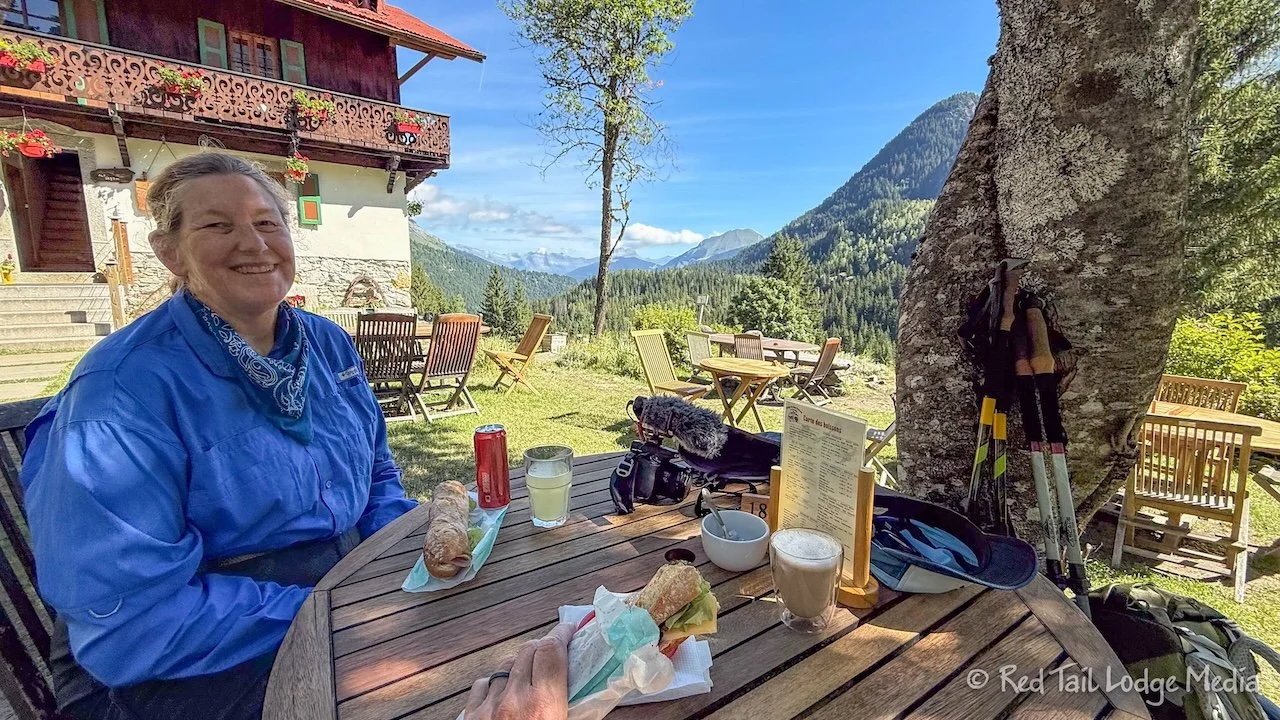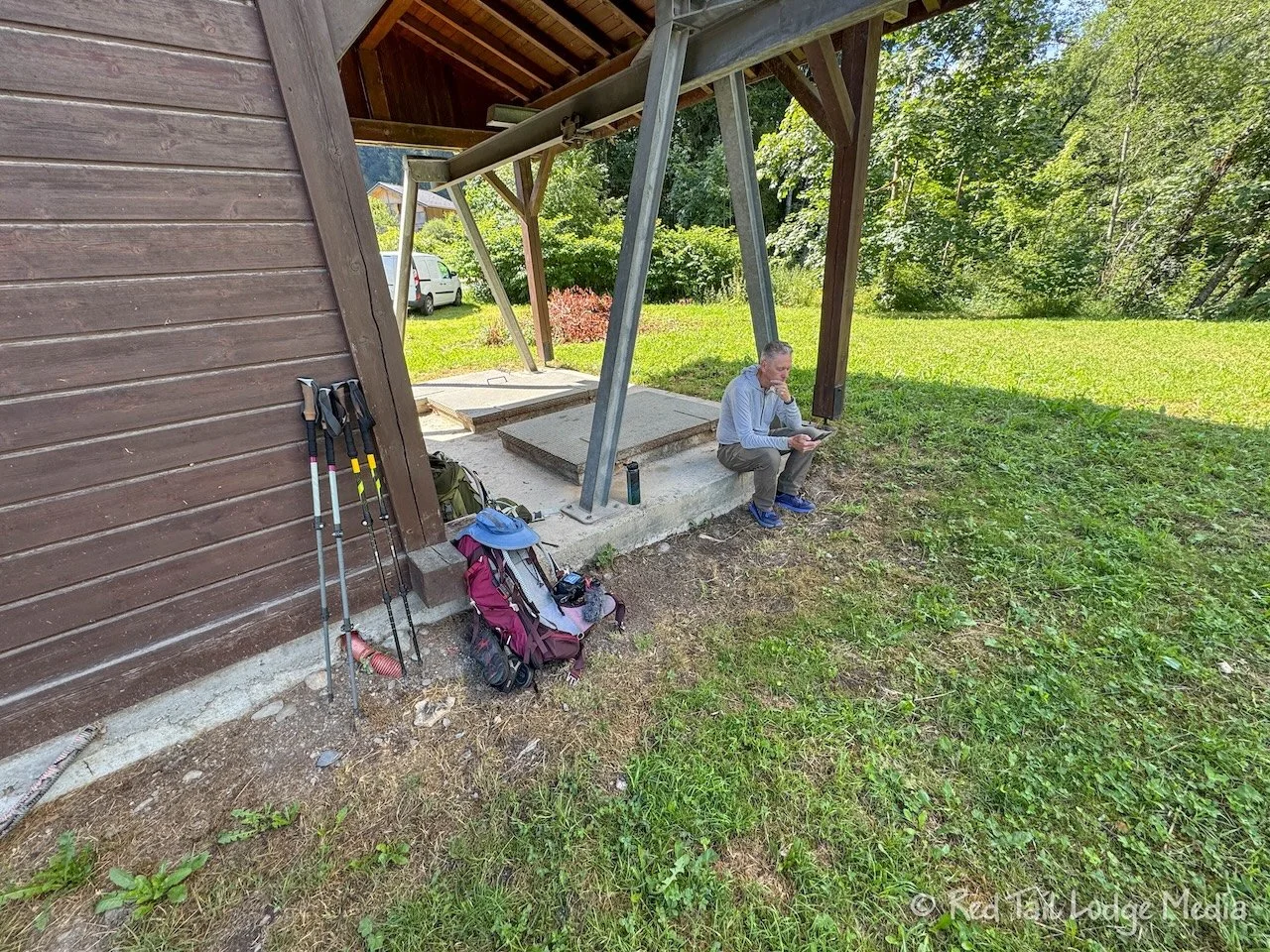 When we reached Refuge Nant Borrant, we stopped for an early lunch. We both ordered ham & cheese sandwiches along with some drinks. We had time to kill because we were only going 7 kilometers (4.5 miles) that day. So we hung out for about an hour. Ann got her laptop out and wrote up her notes from the day before.