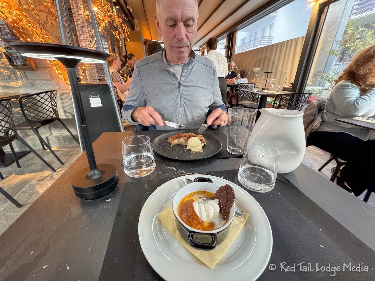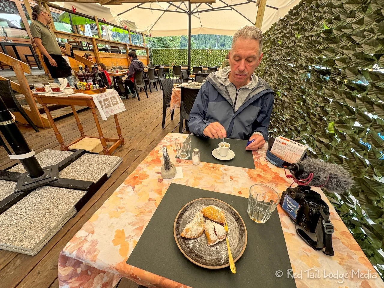 We still had some time before check-in, so Ann ordered dessert and Keith had a coffee. Or at least that is Ann’s excuse for ordering dessert. She tried the Frittelle Valdostane Antica ricetta artigianale, on the waiter’s recommendation. That mouthful of words translates to Aosta Valley fritters, an ancient artisanal recipe. They were apple fritters, similar to beignets filled with apples, cinnamon, raisins and walnuts, topped with powdered sugar. Two thumbs up from Ann! Since Keith ordered a “caffè”, he got an expresso. An expresso is the default coffee in Italy.