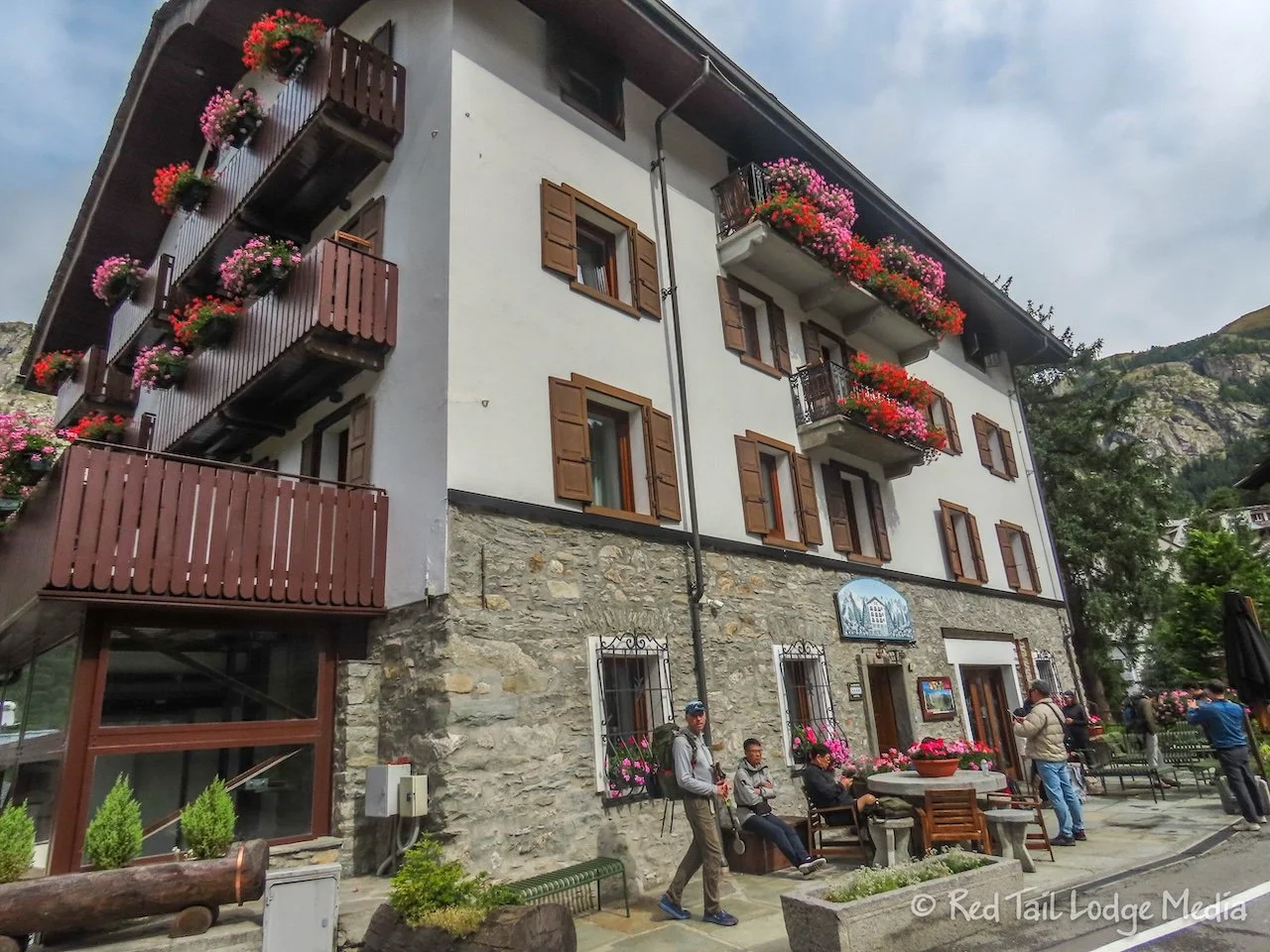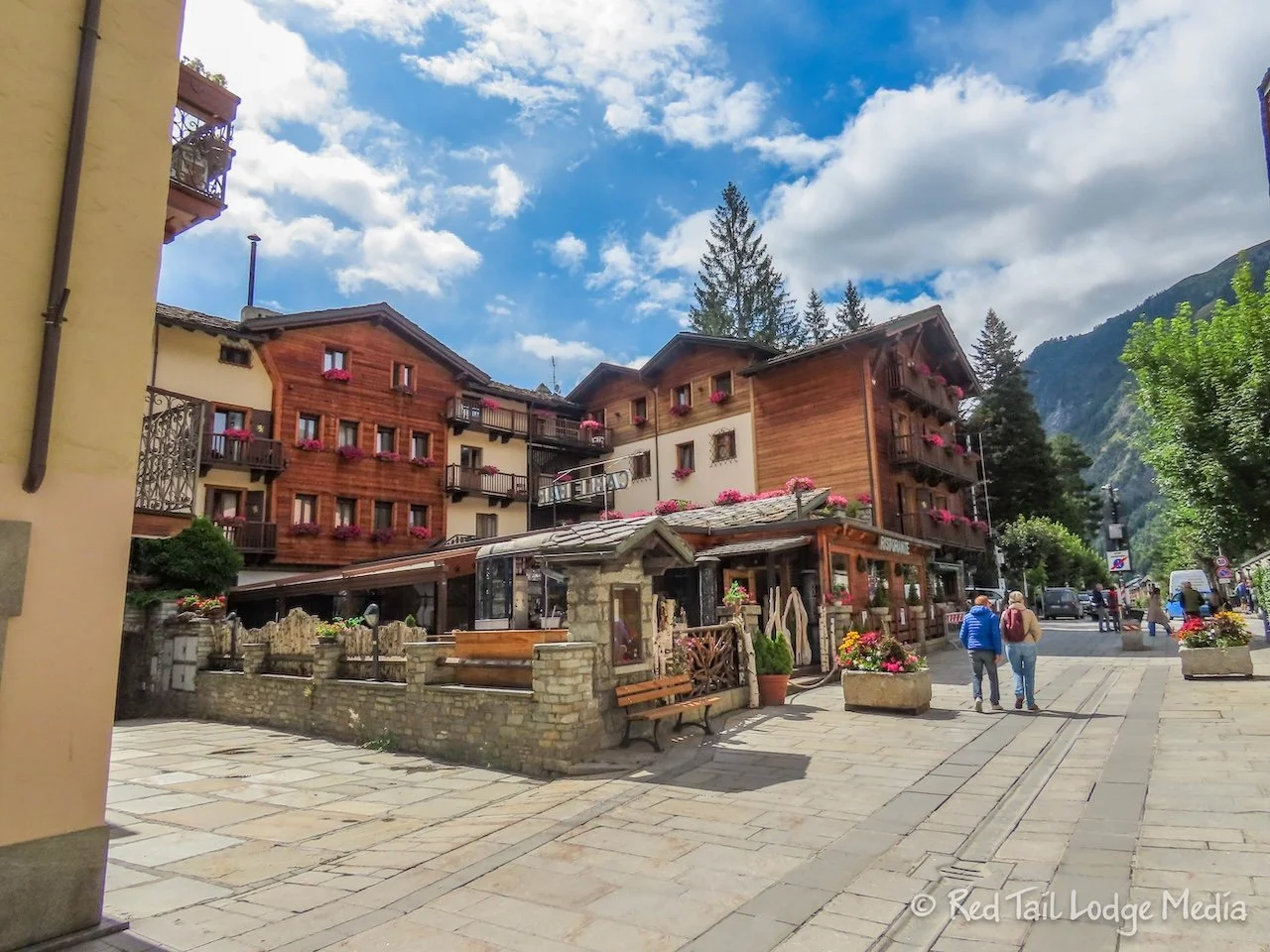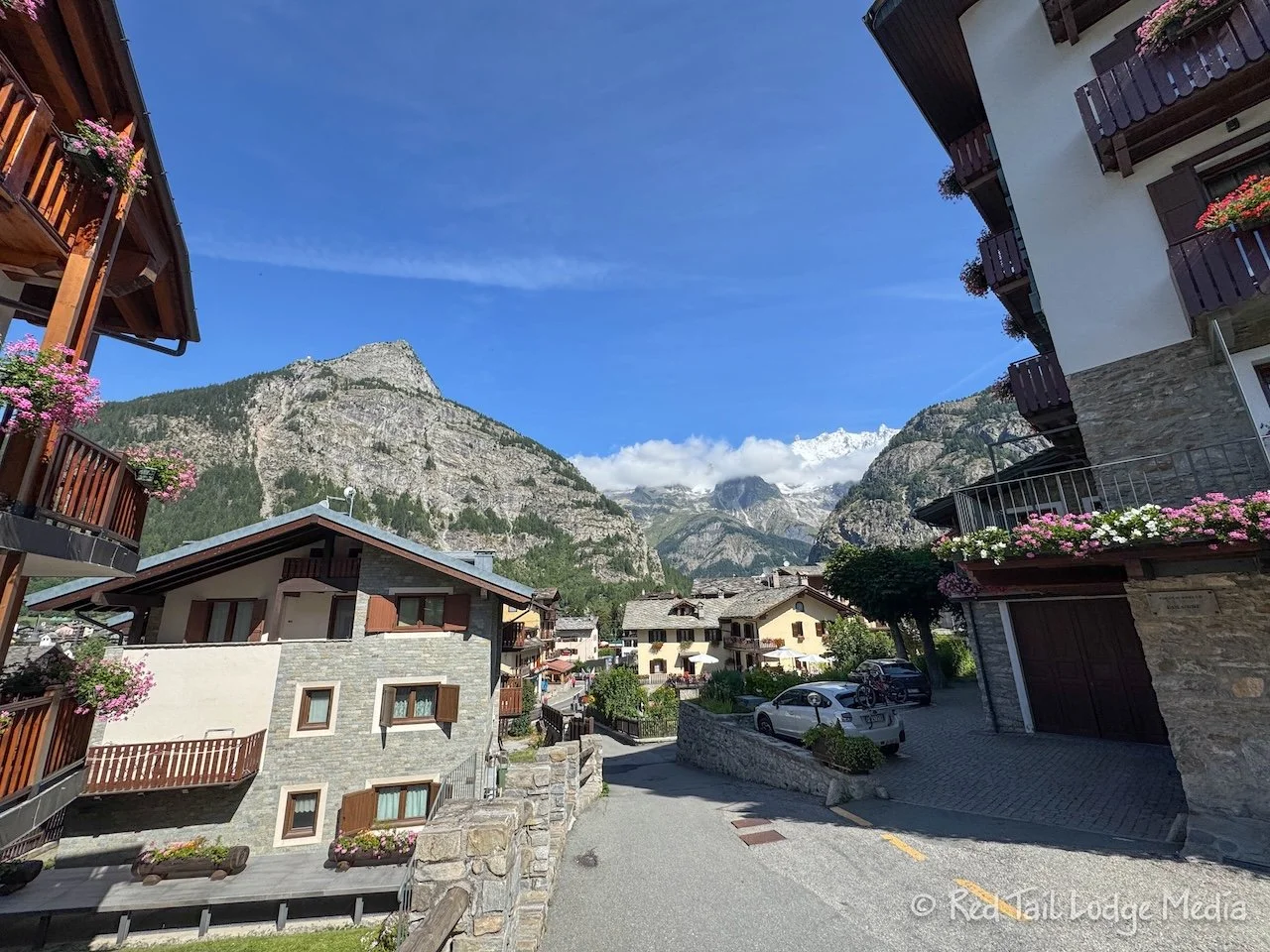 We first entered Courmayeur in the Dolonne area of town, with its very narrow streets and buildings full of character. The thick slate roofs seemed to be the norm. After crossing the Dora Baltea River, we entered the busier part of Courmayeur where most of the hotels, shops, and restaurants were. However, it still had a lot of character.