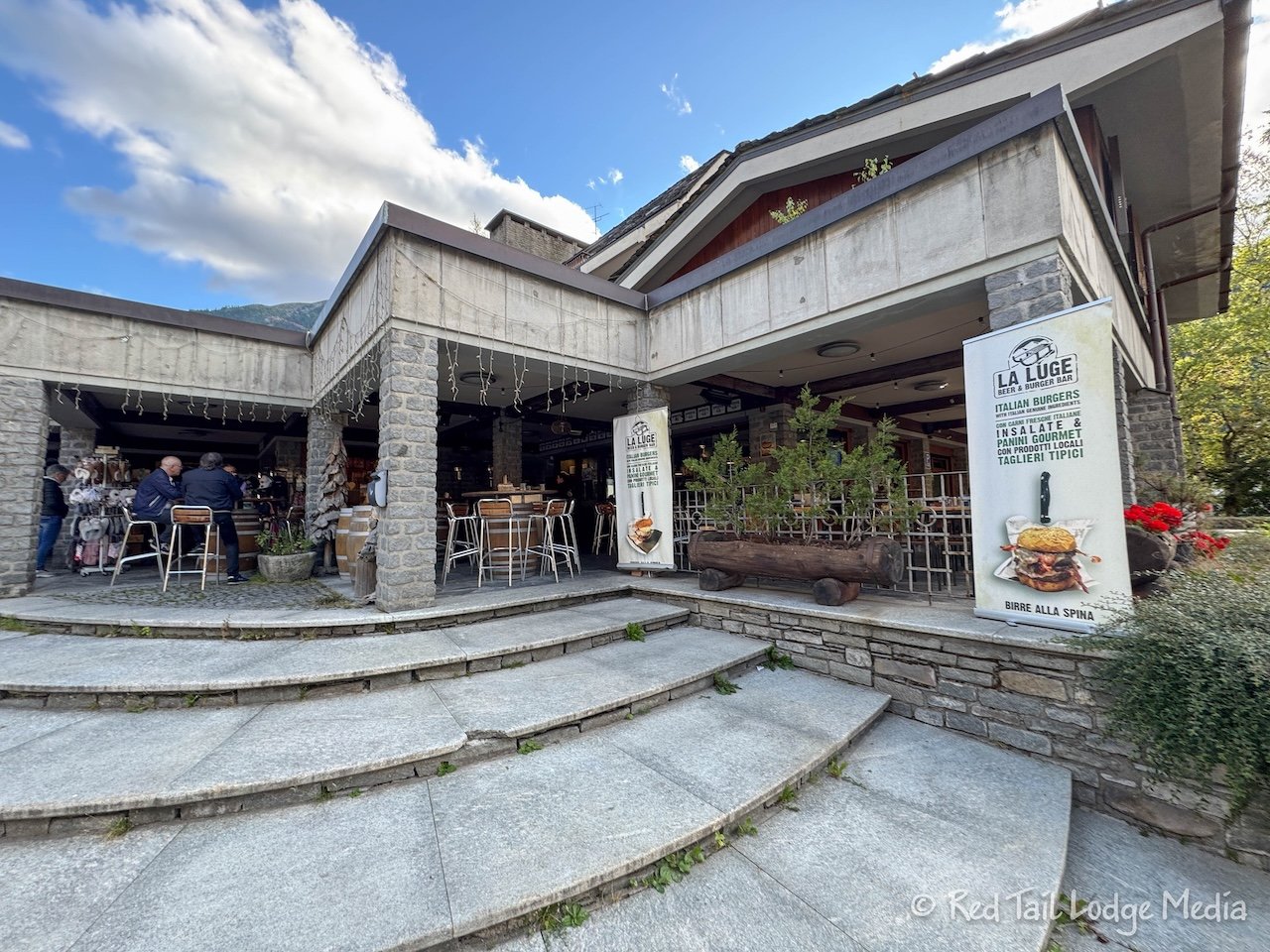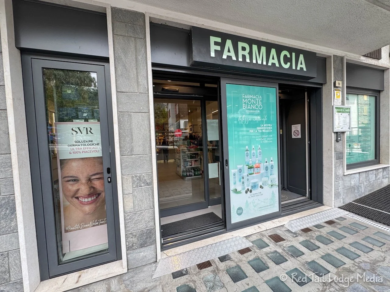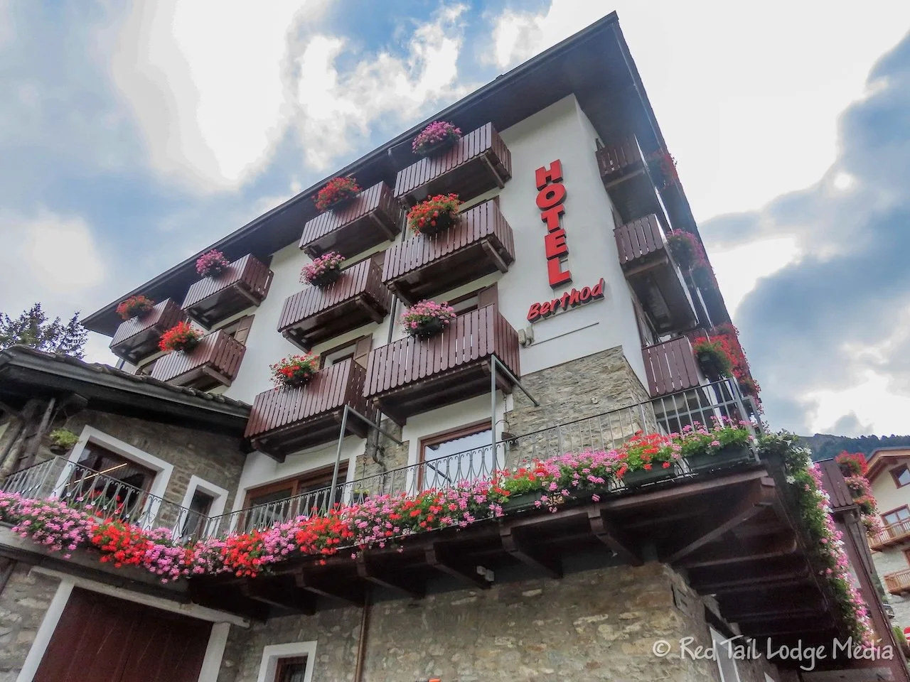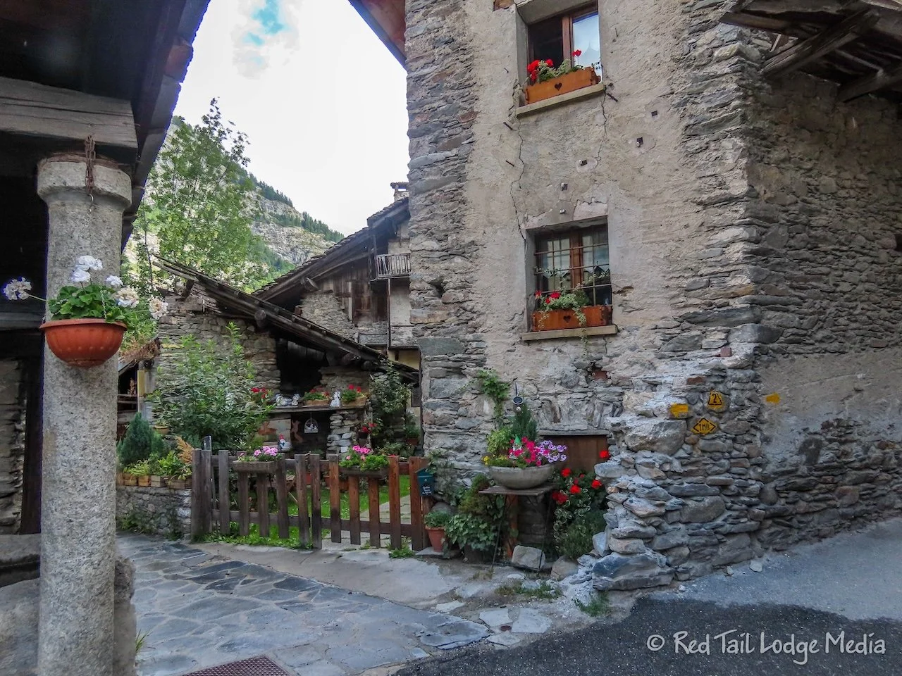 We first entered Courmayeur in the Dolonne area of town, with its very narrow streets and buildings full of character. The thick slate roofs seemed to be the norm. After crossing the Dora Baltea River, we entered the busier part of Courmayeur where most of the hotels, shops, and restaurants were. However, it still had a lot of character.
