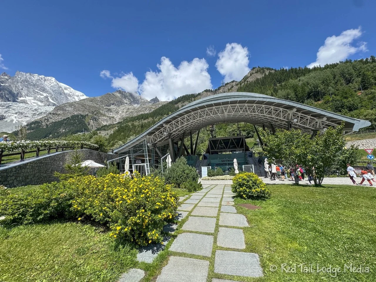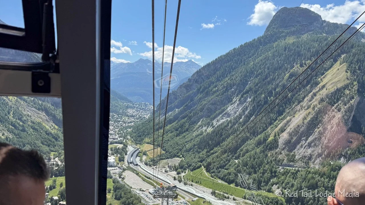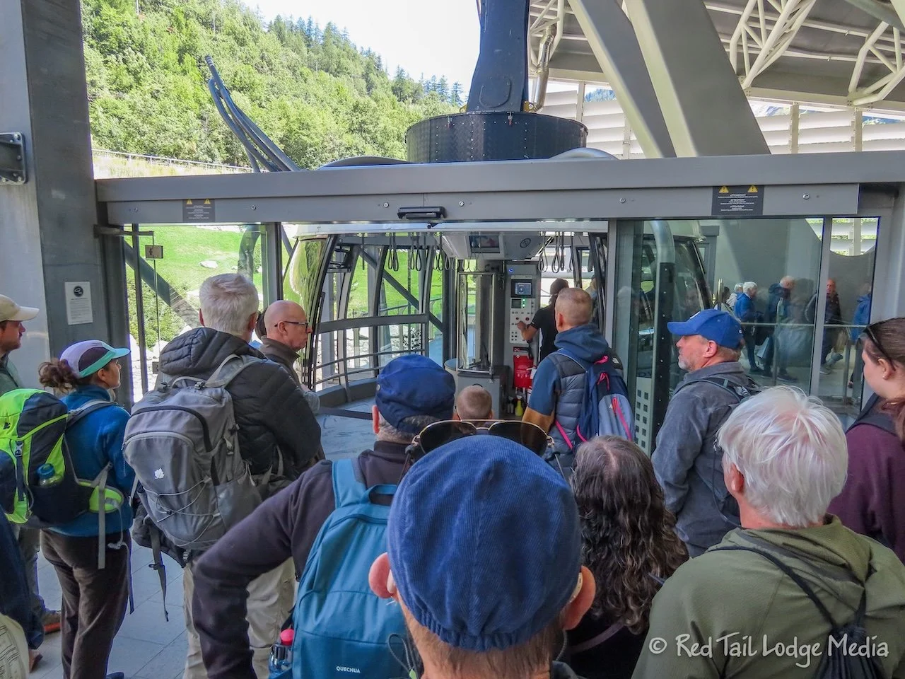 Then it was about time to go to our reserved trip up to Punta Helbronner via the Skyway Monte Bianco. We had reserved an ascent for 1:15 pm, so we needed to arrive at the base station at 1 pm. We could have walked there from the hotel, as it was only 3.4 kilometers (2.1 miles), but Ann was trying to rest to gain energy and let the blister on her toe heal. So we took the free shuttle bus.