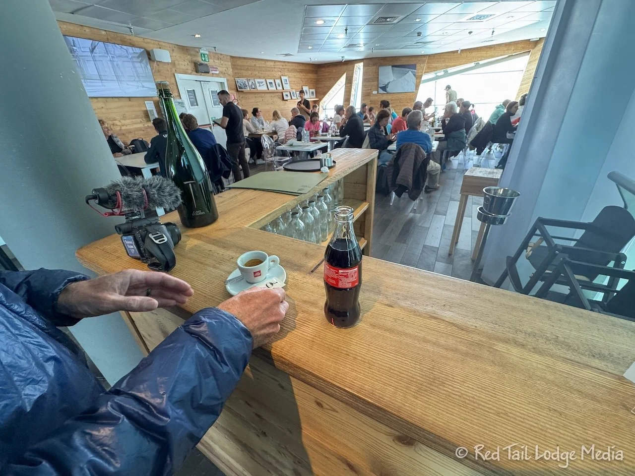We actually had our fill of the cold and the crowds and were ready to go back down before our scheduled time. We went into the bar and ordered a cappuccino and a Coke to kill some time. There wasn’t any place to sit, so we leaned up at a counter to consume our drinks.