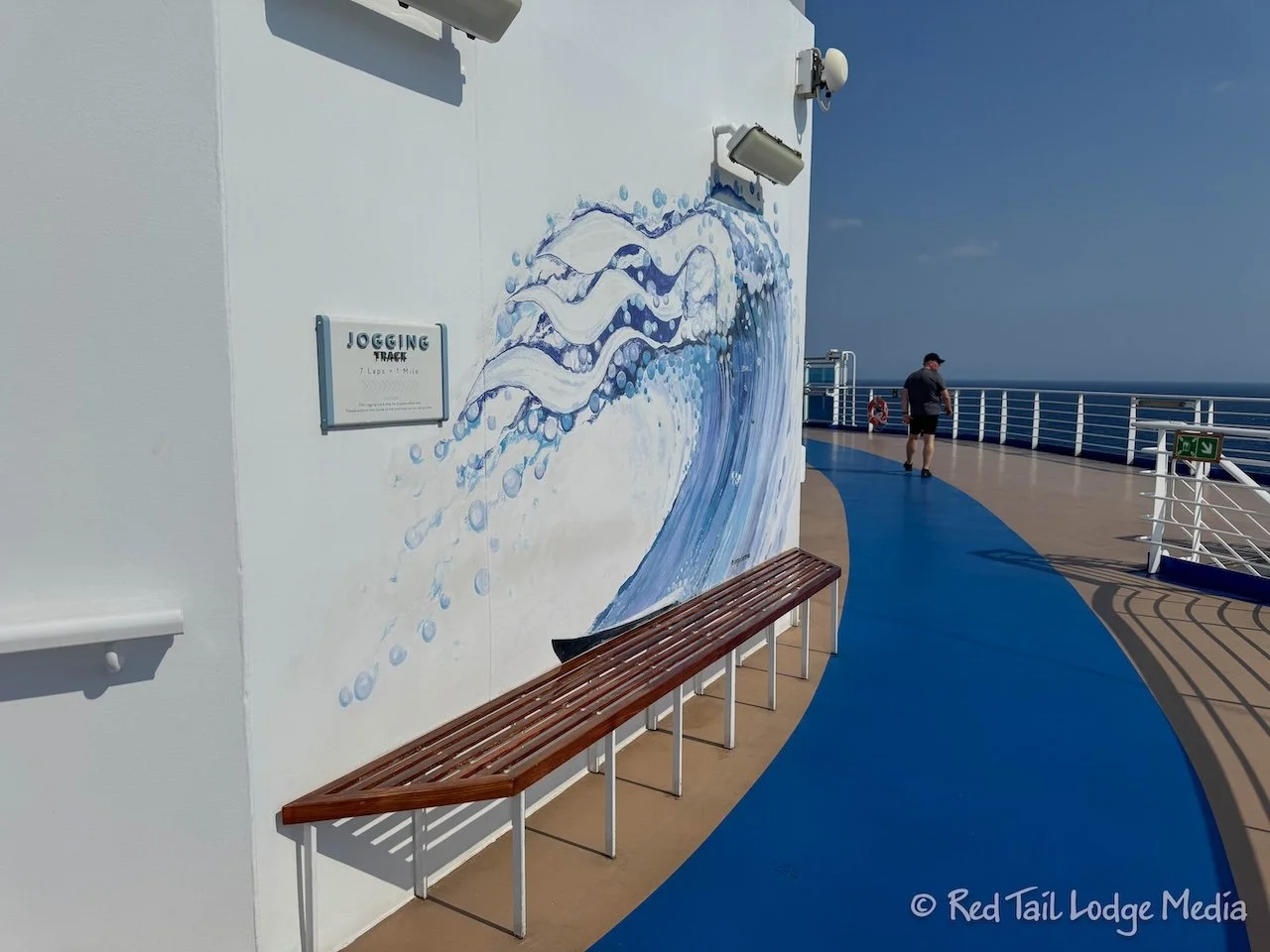 A little later, we headed back up to Deck 16. Ann went up to the jogging track to walk a couple of miles while Keith hung out at a table in the shade near the pool. After getting all sweaty, despite the strong winds keeping her cool, Ann went back to the room to shower and hand wash her clothes.