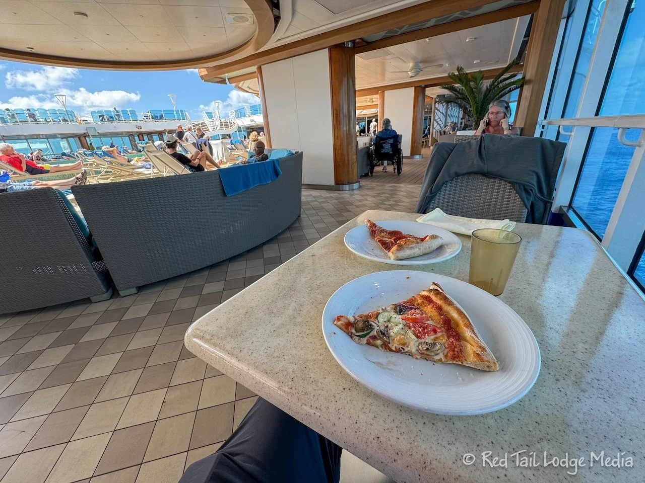 For lunch, we went up to Deck 16 to Slice, where they served pizza. This was the fast food pizza that was included in the base package. There was another pizzeria, Alfredo’s Pizzeria down on Deck 7, but there was an extra charge for that one. The pizza at Slice was pretty good. We tried both their pepperoni and the vegetarian. It had a nice New York style crust, the type that we like. We walked into the buffet area to get some iced tea. We didn’t have the drink package, but there was free ice water, iced tea, and lemonade.