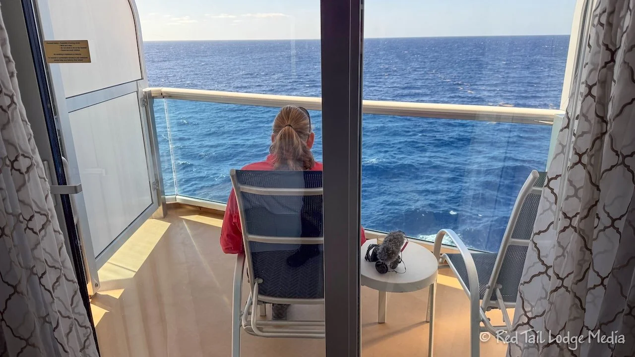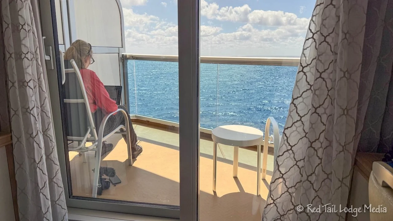 Then we hung out on our balcony again until lunch at the buffet. The captain gave his noon announcements again, but this time we didn’t change our clocks. Then it was back to our room to hang out again. Ann worked on a video while Keith took a nap. Hopefully, that doesn’t indicate how boring her video is.