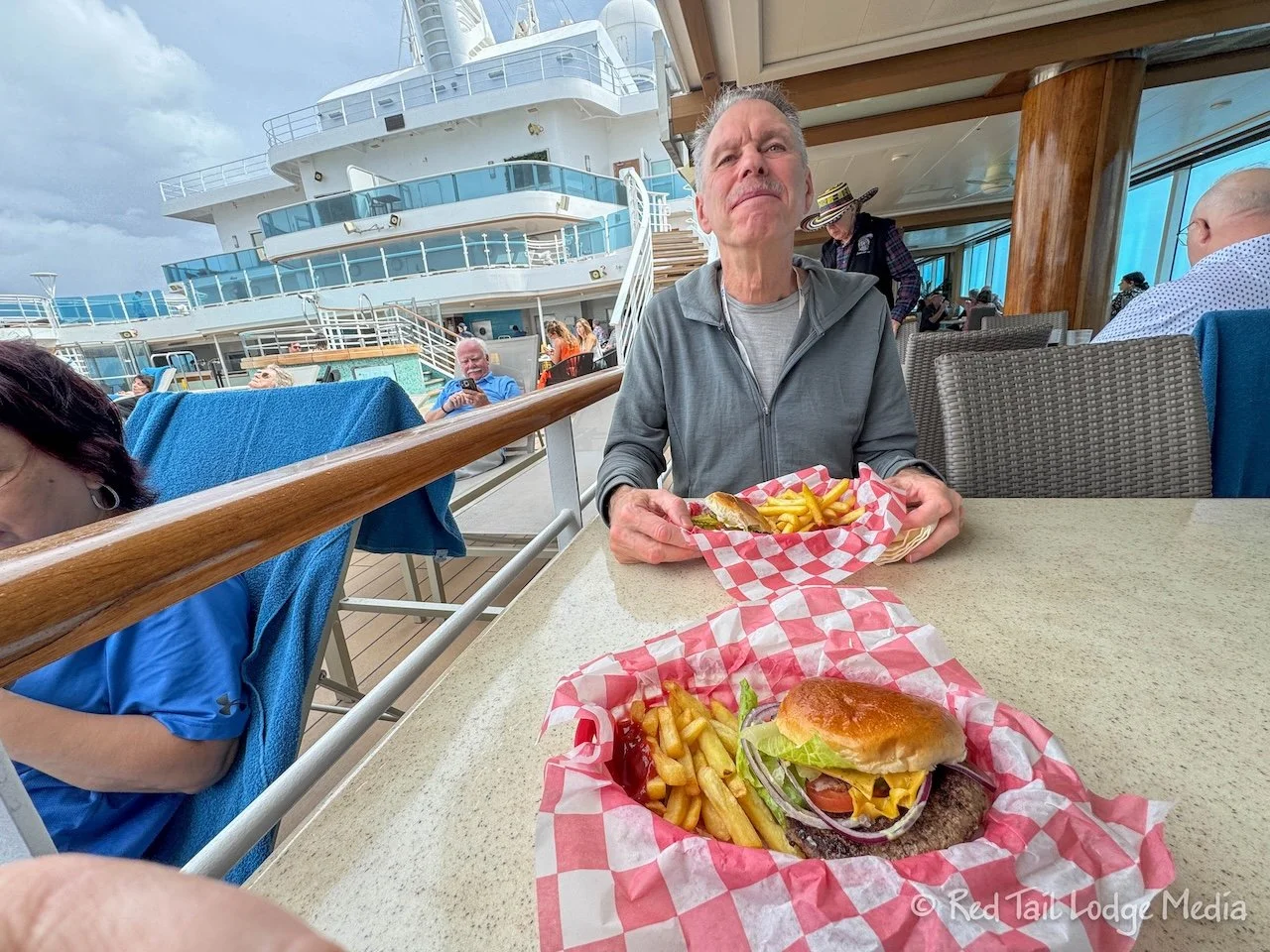 For lunch, we also tried something new, the Salty Dog. It is near the Slice pizza place on Deck 16 with the pool. Ann had the classic burger while Keith tried the chicken sandwich, both paired with fries. Ann was surprised Keith didn’t get a hot dog, as he is usually a big fan of them. The sandwiches were OK, but we both felt the pizza at Slice was better.