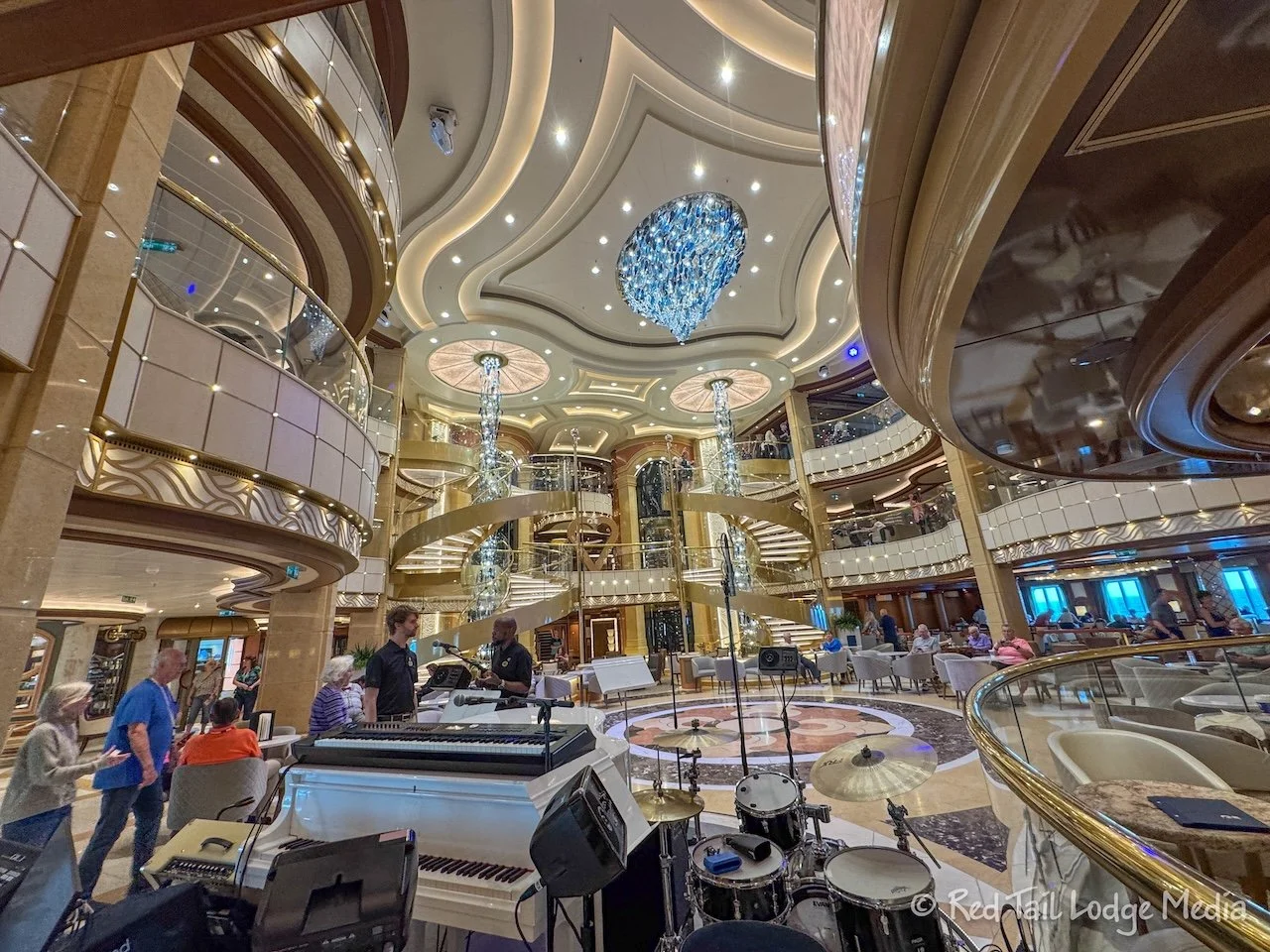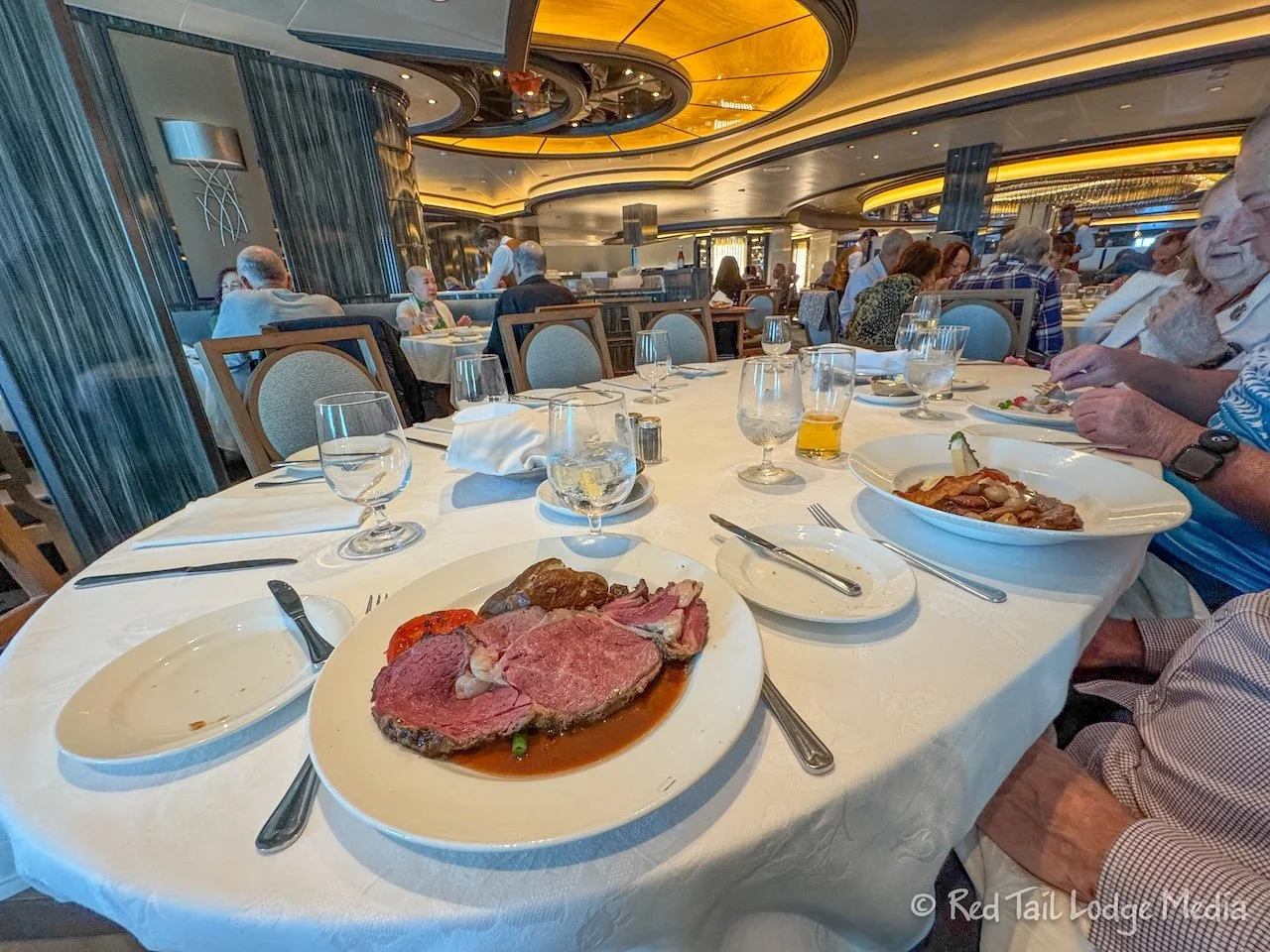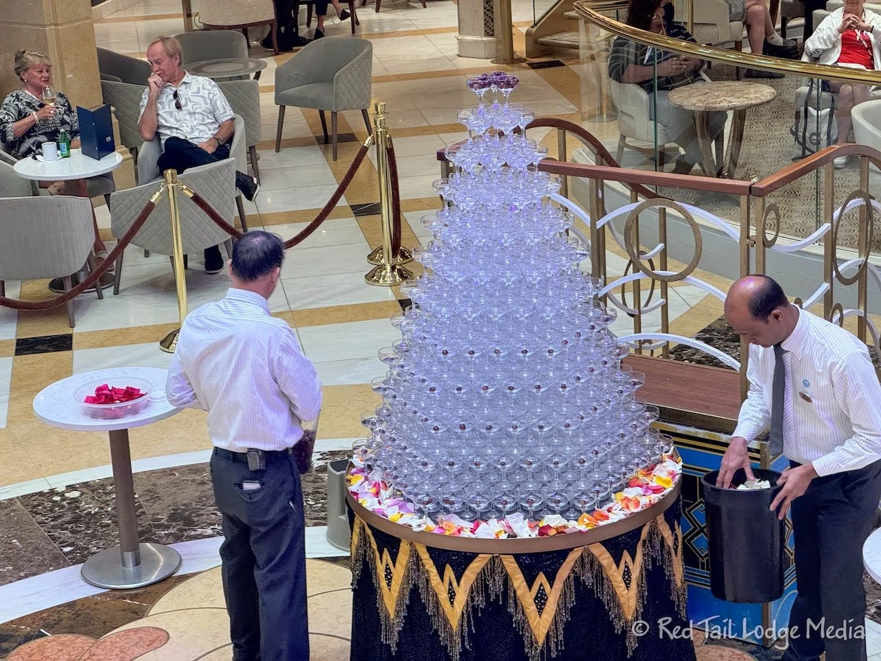 Then it was time for dinner. It was formal night and we weren’t sure if they would let us in. As we passed through the Piazza on Deck 5, they were setting up the champagne glasses for the Captain’s Champagne Waterfall. Unfortunately, we were not done with dinner in time to see the event at 6:15 pm.