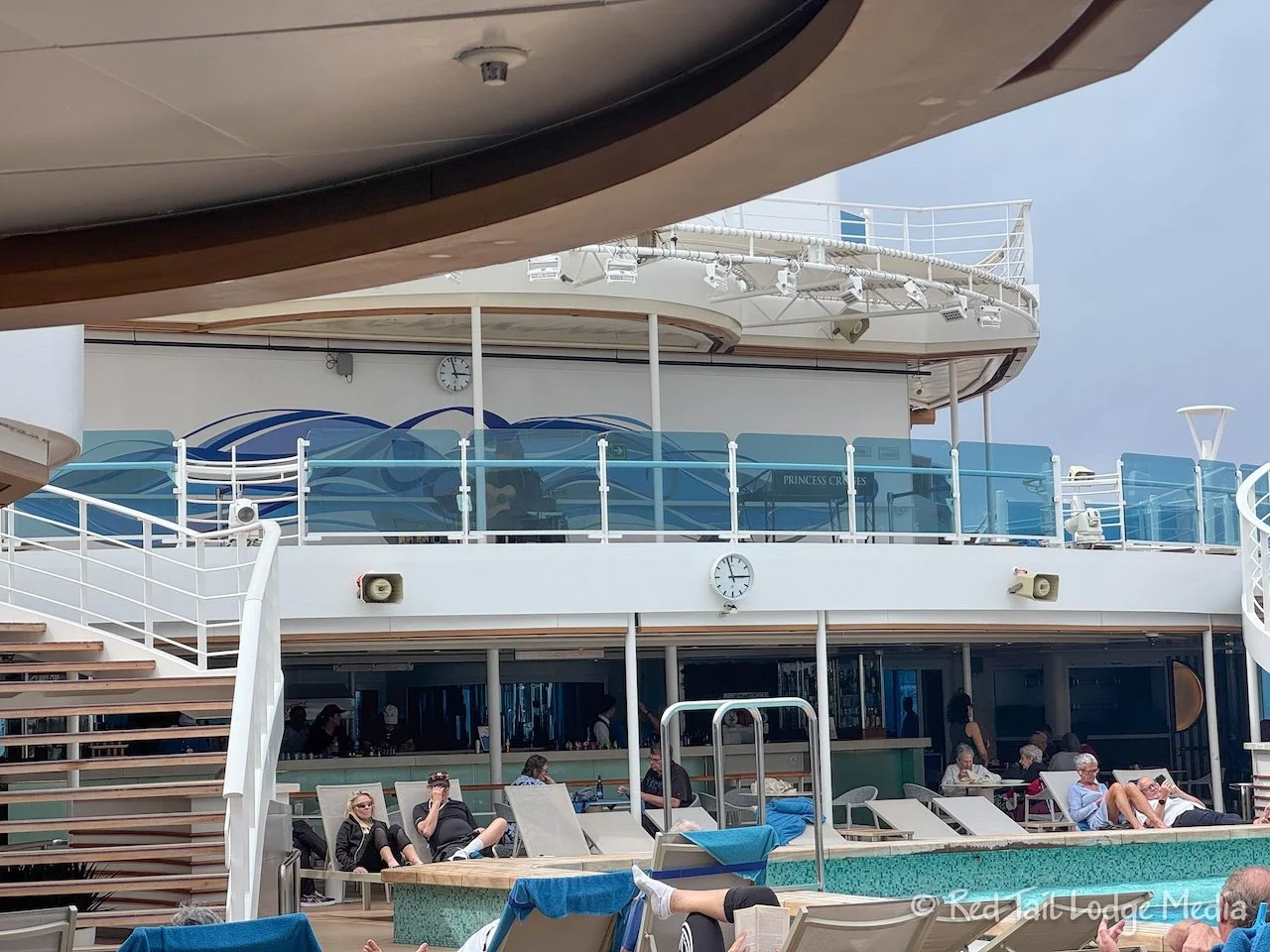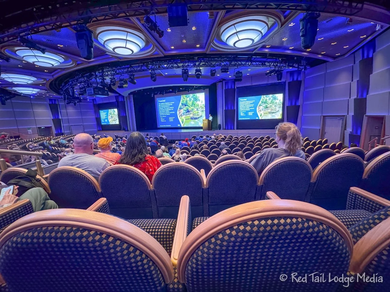 At 10 am, we went down to Deck 7 to listen to the Shore Excursions Live Tour Presentation in the Princess Theater. We have been avoiding the elevators and using the stairs. Having our room on Deck 9 meant that we were only going up six flights (there is no Deck 13) to get to Deck 16, or down four flights to get to Deck 5 (there aren’t any public areas below that except for Medical on Deck 4).