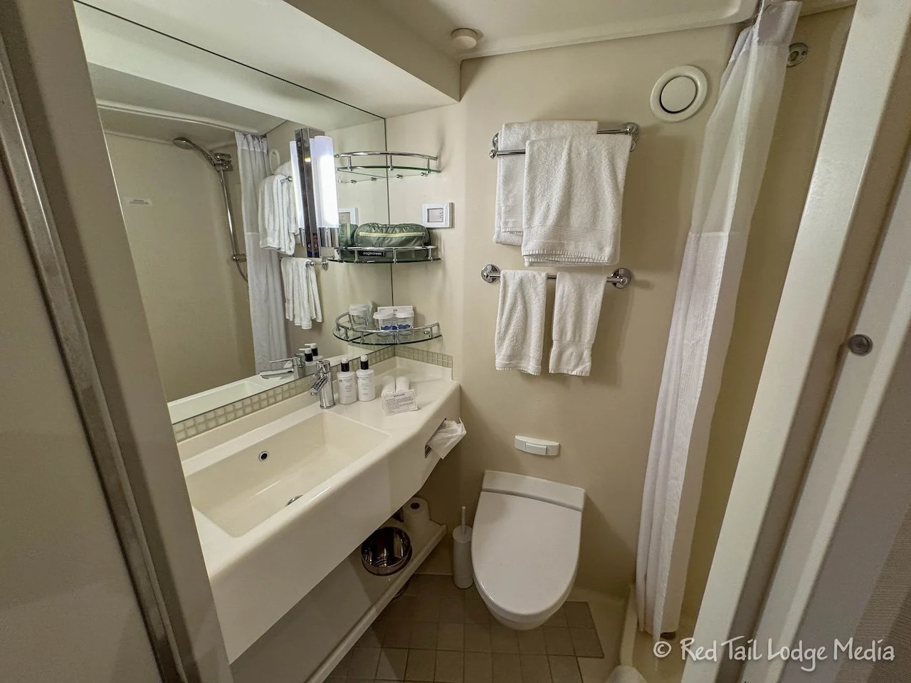After a delicious lunch, our room was ready. So we went down to Deck 9 to check out the room. We had a balcony room, about mid ship, on the starboard (right) side. The room was nice. There was a queen sized bed, a desk, a large closet area, and a compact bathroom. The bathroom is smaller than a hotel room bathroom but much larger than the bathroom we are used to in our RV (a Winnebago EKKO).