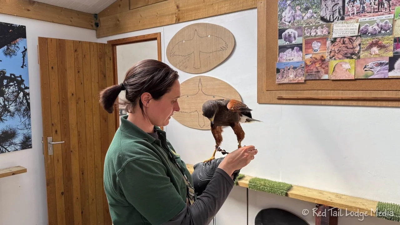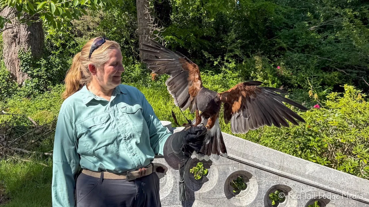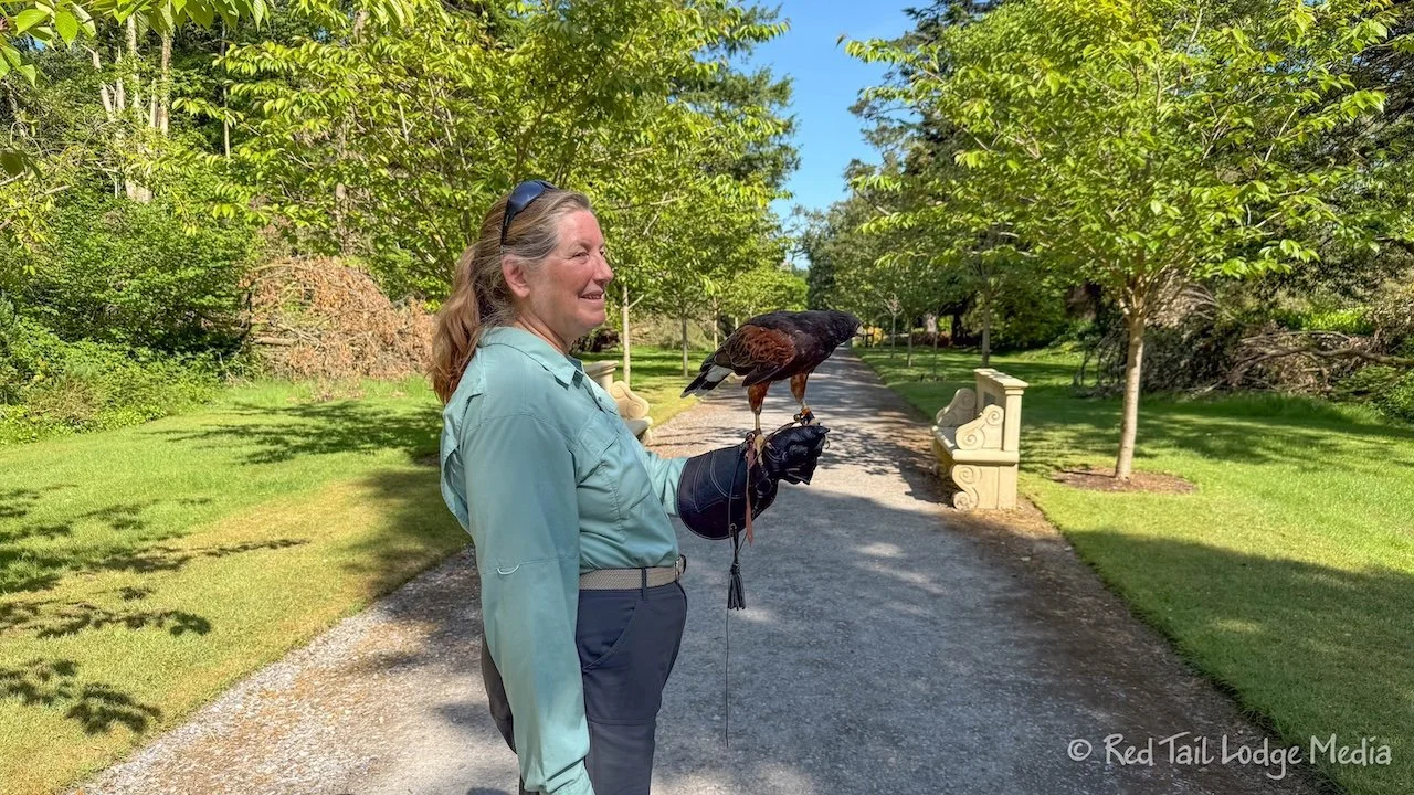 We learned that the birds don’t actually eat their prey right away. They store the food in a pouch located in their esophagus called the crop. After the birds are done hunting, they will later find a safe place to go to digest their food. So by the time our Hawk Walk was over, we could see the bump on the front of Samhradh’s neck where he was storing his food.