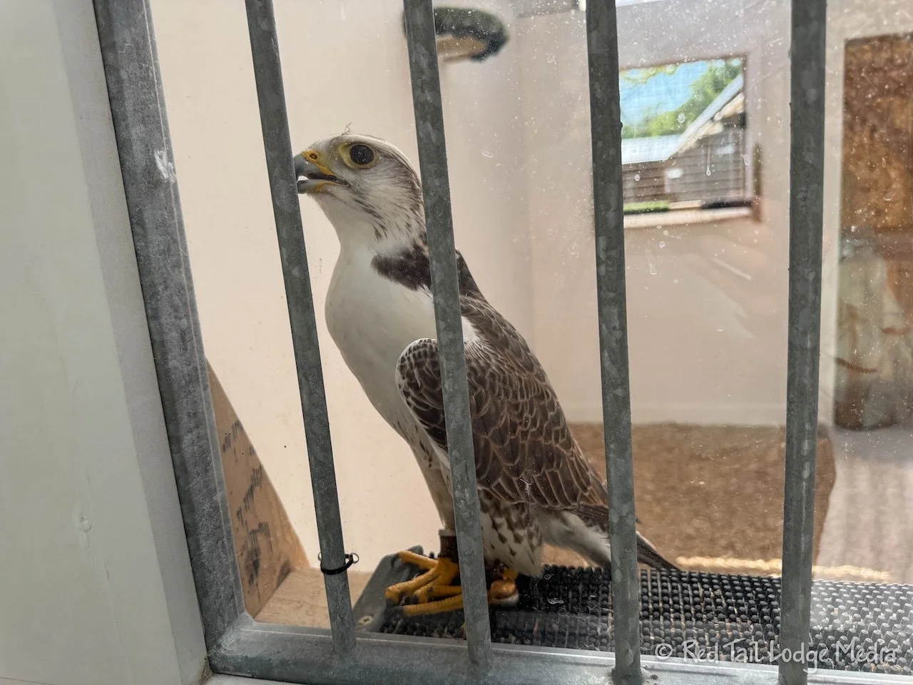 After Samhradh’s last flight, Alyse gave him a large treat. Then Keith held the leather straps as we walked back into the falconry school. After returning Samhradh to his girlfriend in their cage, Alyse took us around to the rest of the birds in the school.