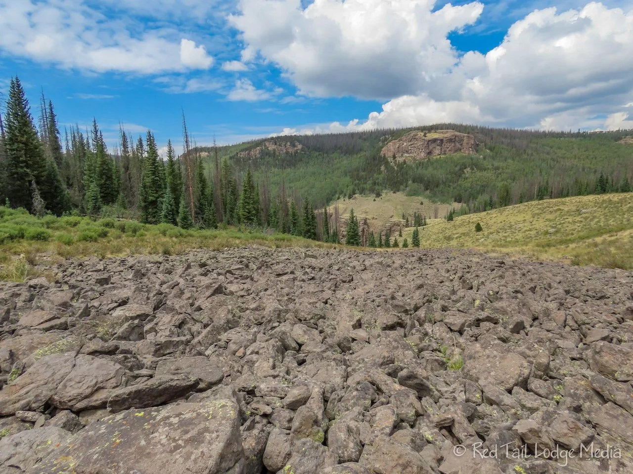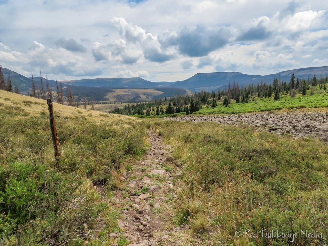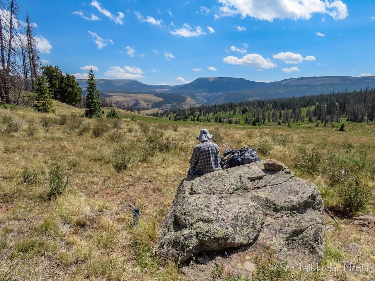 The trail is mostly downhill to the creek, but then it heads up 1000 feet during the next four to five miles. The trail followed alongside the creek for a little while, passing through a few more boulder fields before taking a left turn up a small canyon. It rises out of the canyon, crossing through woods and wide-open meadows. At about mile four, there was a large boulder where we stopped to eat our lunch. The boulder provided a nice place to sit with views out across the mountain valleys.