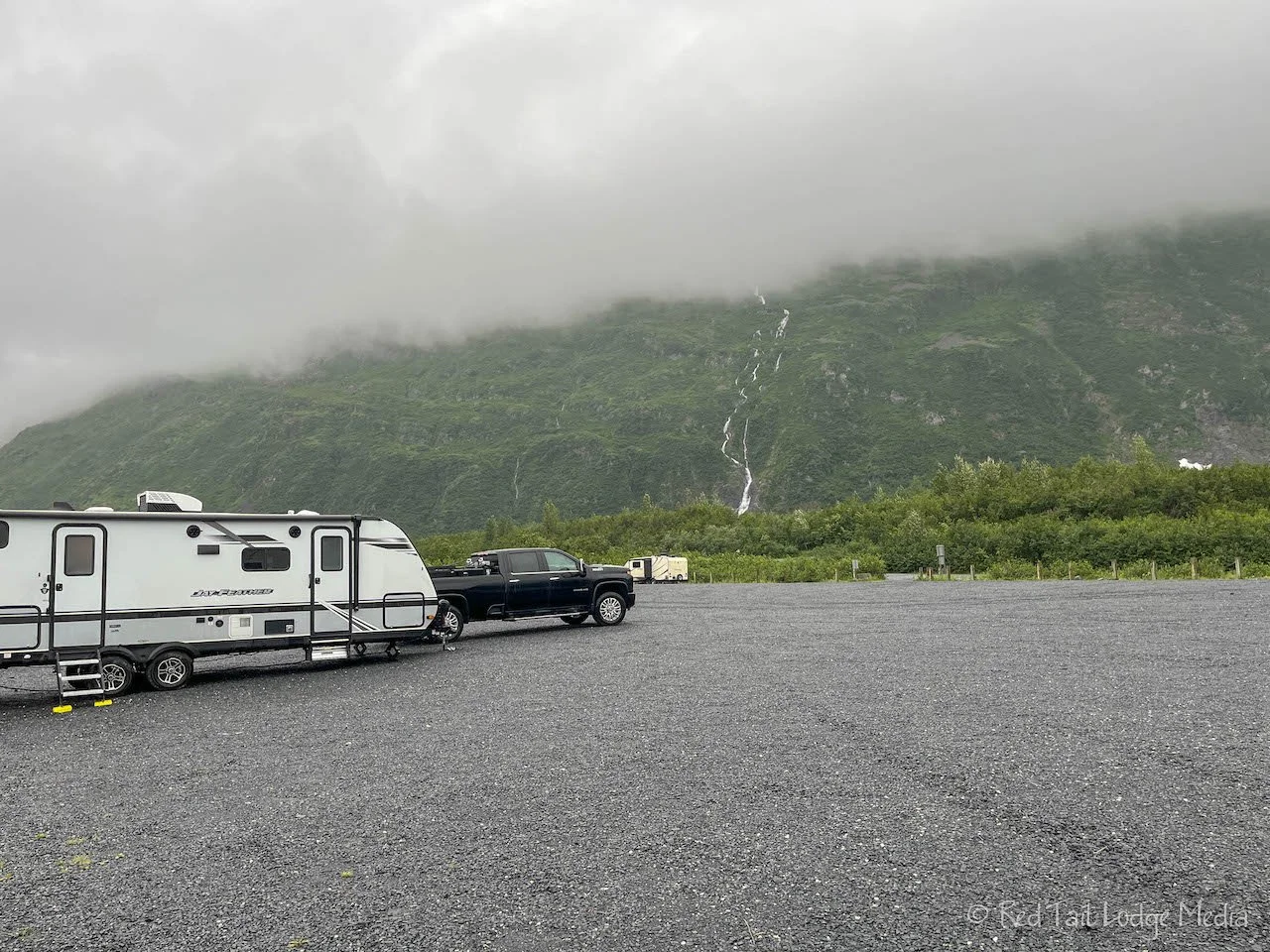 When you come out of the tunnel, you are in Whittier. There is not much to the town of Whittier. The first left took us over to the Whittier Bay Campground, run by the city, where we planned on spending the night. The campground is a gravel parking lot with a couple of vault toilets and a garbage dumpster. It supposedly has some nice views. We managed to spot a couple of tall, gorgeous waterfalls on the nearby mountains before the fog obscured them from our view.