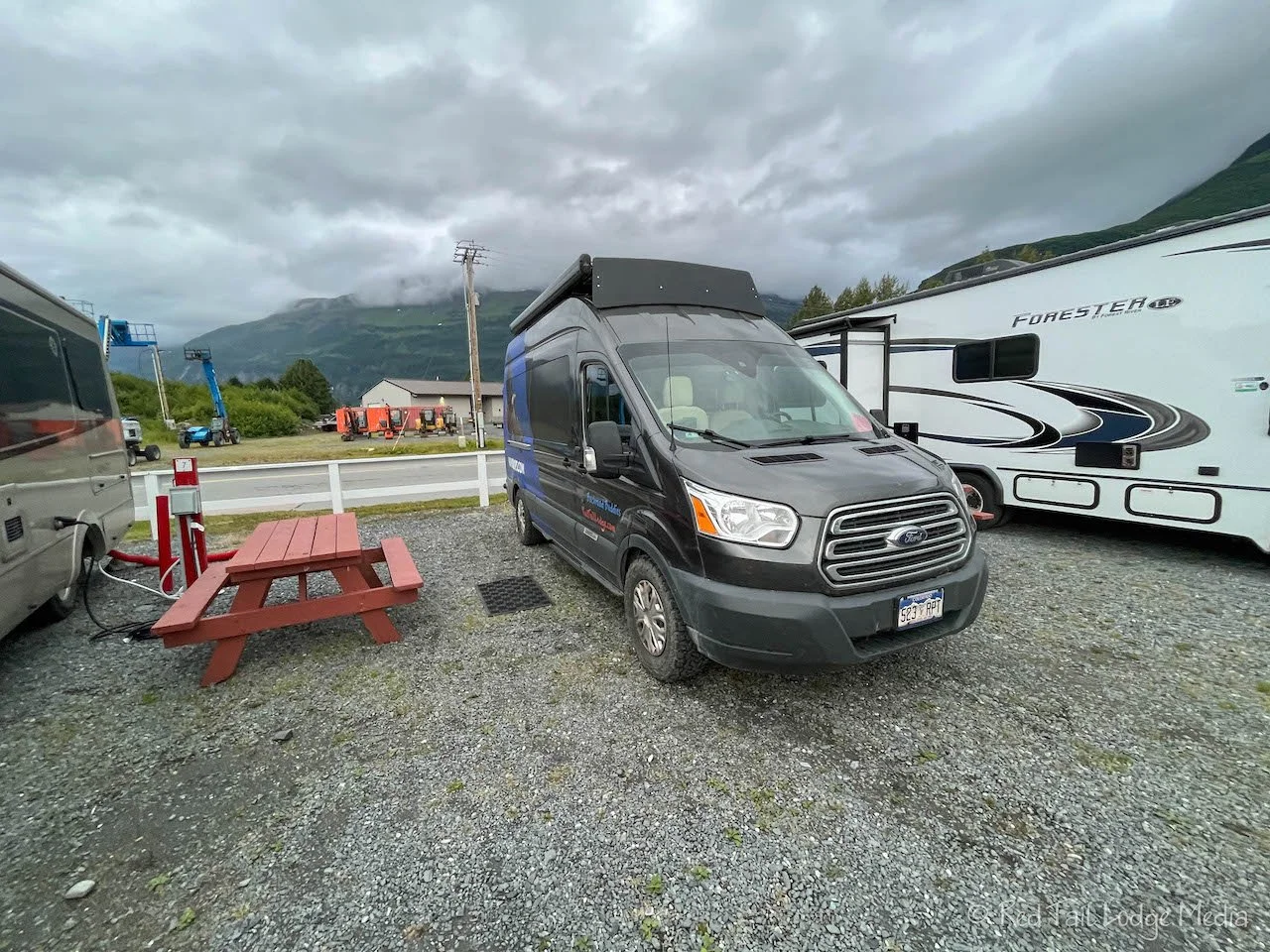 A posted sign said to pay for camping at the harbor office. We weren’t sure where that was, so we asked another camper. He described the Harbor Master Office to us, so we headed into town to find it. The Whittier Harbor Master was listed in Google Maps, now that we knew the Harbor Office and the Harbor Master Office were the same thing. The person in the office was very friendly and gladly took our credit card for payment. It was $20 per night to camp. As the evening progressed, the rain got heavier and the winds got stronger. Luckily it was a shorter walk to the toilet than where we stayed in Seward, because it felt like we were walking through a storm to get there. Needless to say we spent the evening inside our toasty Red Tail Lodge (our van).
