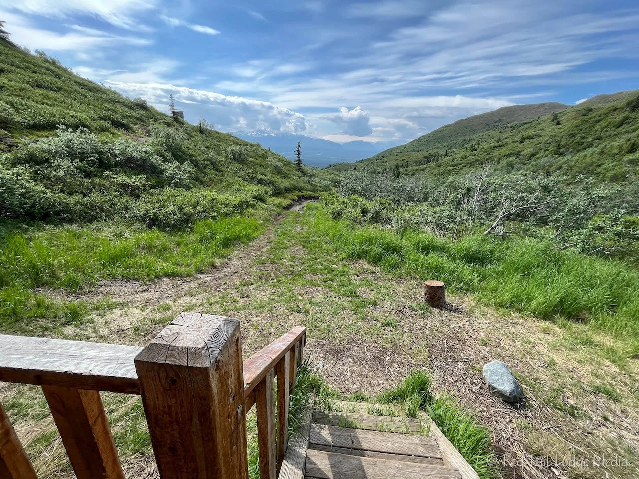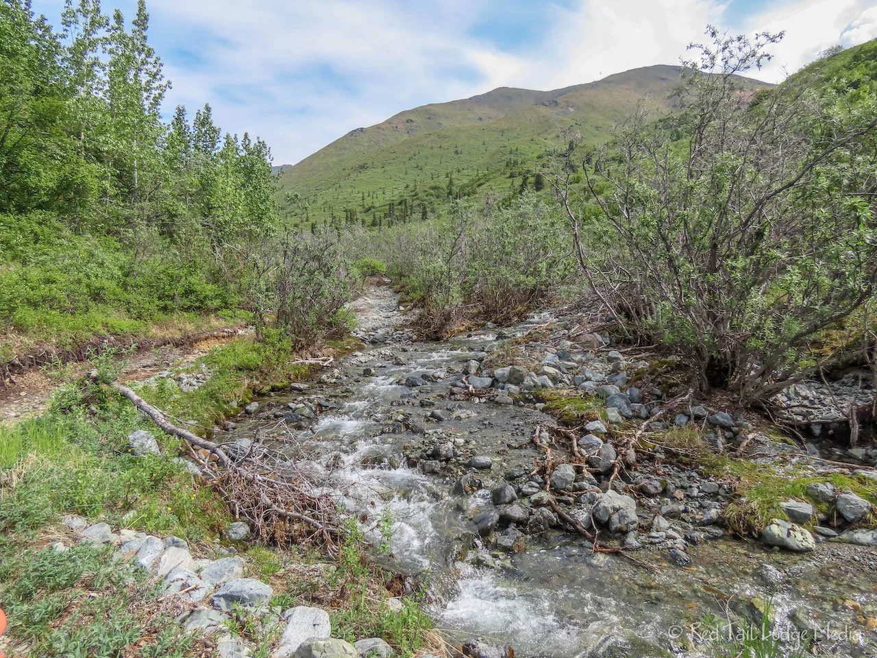 Nebesna Road is situated in a wide valley. Unfortunately, the most interesting mountains, like Mount Sanford and Mount Wrangell, were on the far side so they were hard to see through the haze. However, we still enjoyed the view from the cabin porch, with the sound of the creek flowing nearby.