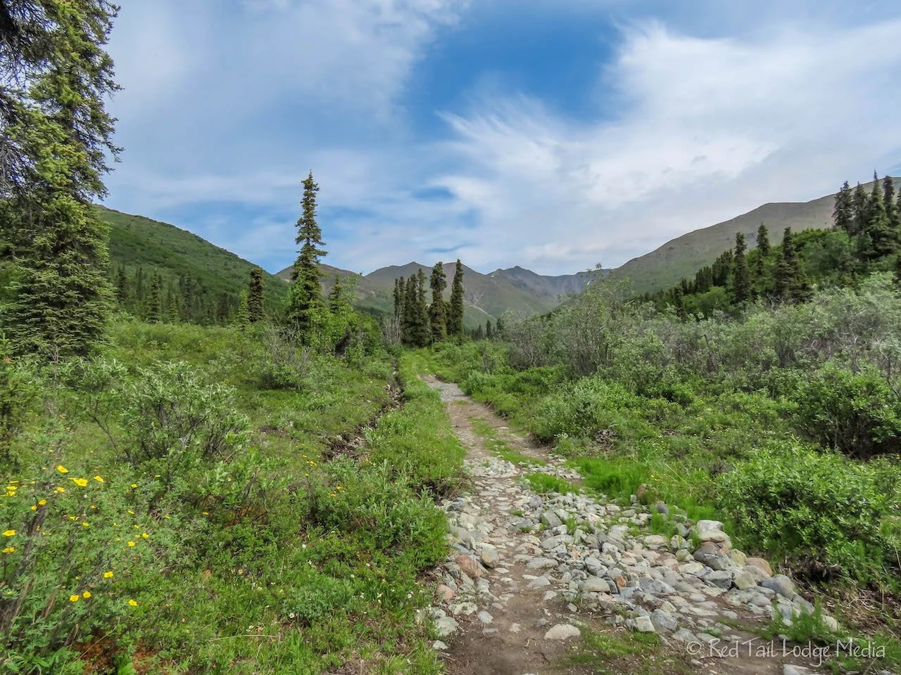 After the creek crossing, the trail started to ascend a little steeper. The trail was nice and wide, wide enough for an ATV. We learned that Wrangell-St. Elias National Park and Preserve allows locals to subsistence hunt within the national park. Sport hunters are allowed to hunt in the national preserve which surrounds the national park. The ranger warned us that locals are allowed to drive ATV’s on the trail.